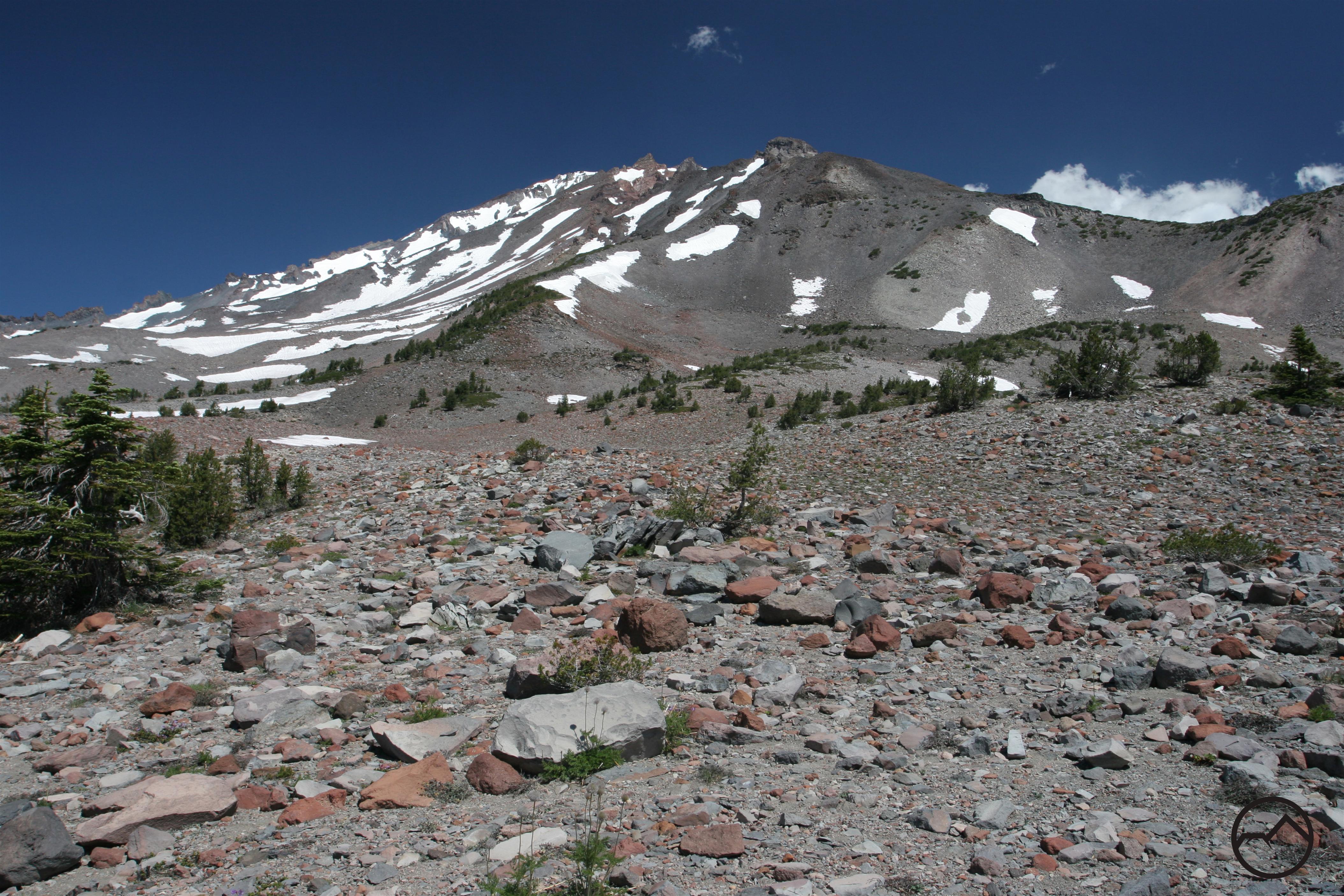 Just days before my parents arrived, I had been uploading pictures to Hikemtshasta and just happened to have uploaded an image that featured the great volcano from the same perspective as it was painted in the old picture. When I saw the picture I instantly recognized it for what it was. Rather than being a painting of Mount Shasta from somewhere down below or from a distance, it was a portrayal of the mountain from on the mountain. Specifically, it was the view from the top of Hummingbird Saddle, which is the divide between the Old Ski Bowl and the Valley of the Moon. In an act of artist’s license, the painter added far more trees than are actually present and included a cabin that may or may not have existed at that spot. The unusual angle, the trees and the cabin all contributed to obscuring the fact that is really was Mount Shasta.