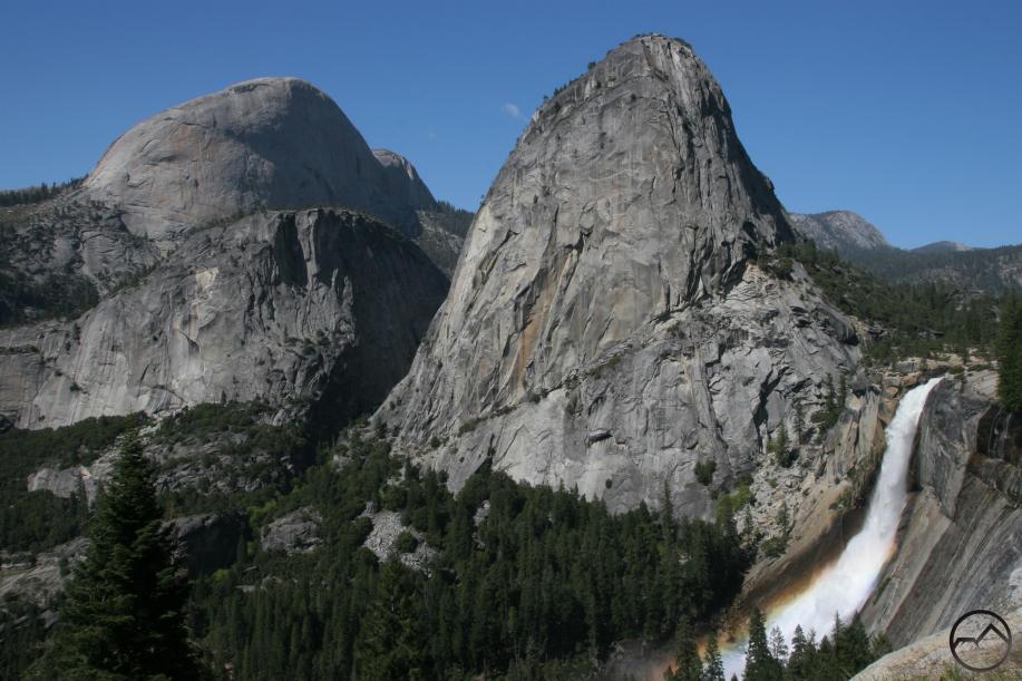 Once the trail joins the John Muir Trail, it is only a short distance to an awesome bit of trail that features a stupendous views of Nevada Falls racing down a cliff beneath Half Dome, Mount Broderick and Liberty Cap.