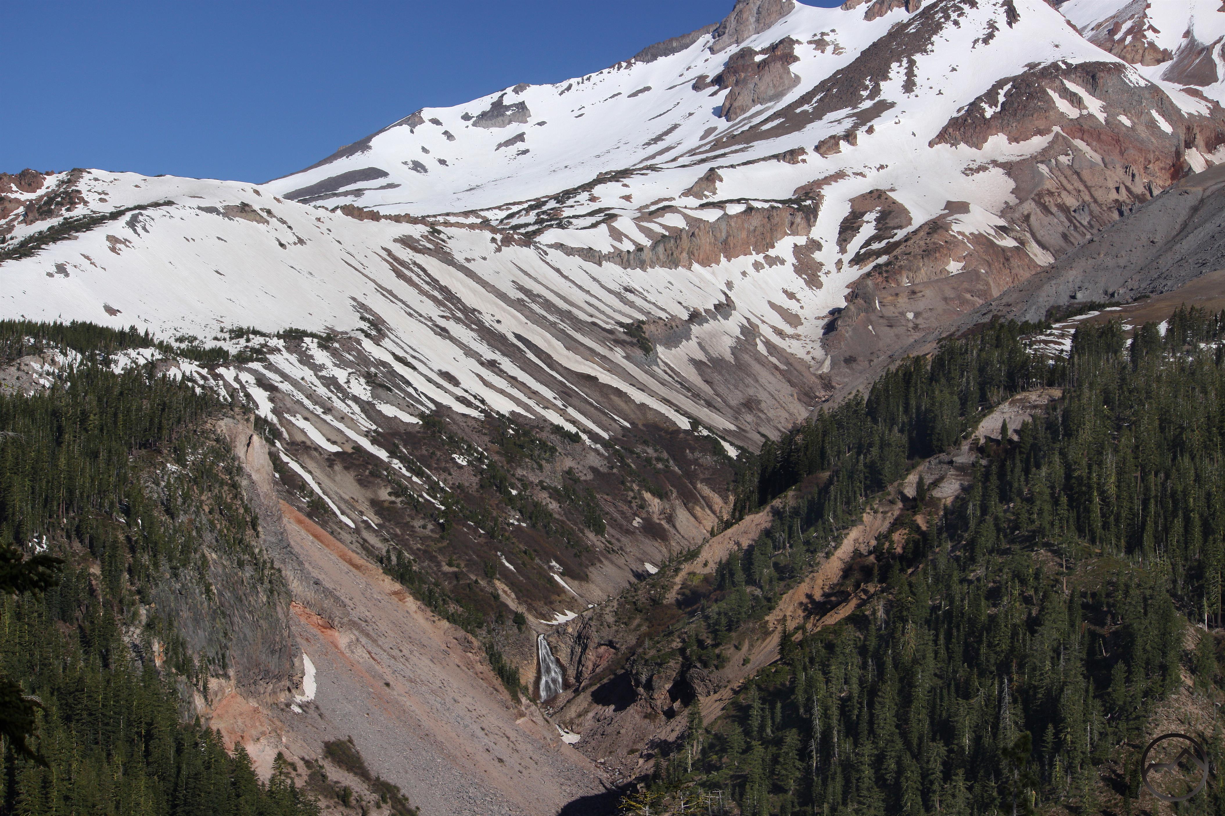 Mud Creek Canyon is easily among the most dramatic, spectacular features on Mount Shasta. If the mountain had been designated a national park as John Muir had advocated, the canyon would surely draw more attention and have achieved an iconic status. Even though Mud Creek Canyon languishes obscurity it remains one of the most staggering and stupendous natural wonders in California. Beginning high on the south side of Mount Shasta, at the foot of the Konwakiton Glacier, the canyon begins its epic descent down the flanks of the mountain. At its mouth, nascent Mud Creek pours several hundred feet over Konwakiton Falls. Below the waterfall the narrow canyon deepens considerably while the creek disappears beneath a layer of scree-encrusted ice and loose rubble. Nearly a mile below Konwakiton Falls the canyon widens and takes on the classice V-shape of the other gorges on the flanks of Mount Shasta. However, while the shape may be the same, the proportion is not. Rather than being several hundred feet deep like canyon siblings, this section of Mud Creek Canyon is well over 1,000 feet deep. Its scale is simply epic. The large V-shaped section comes to an end at an impressive band of cliffs where Mud Creek flows of its magnificent, eponymously named waterfall, the largest on Mount Shasta. Below the falls Mud Creek is joined by Clear Creek, which has just completed its own 1,400 foot descent down a series of awesome cascades. Below the confluence, the canyon takes on a more typical appearance with wooded slopes punctuated by occasional cut banks, though it is still nearly 800 feet deep. From here the canyon is lost from the public consciousness as its journey takes it beyond the sight of any trails. It does not emerge into view again until its journey is nearly complete and is crossed by Pilgrim Creek Road and Highway 89.