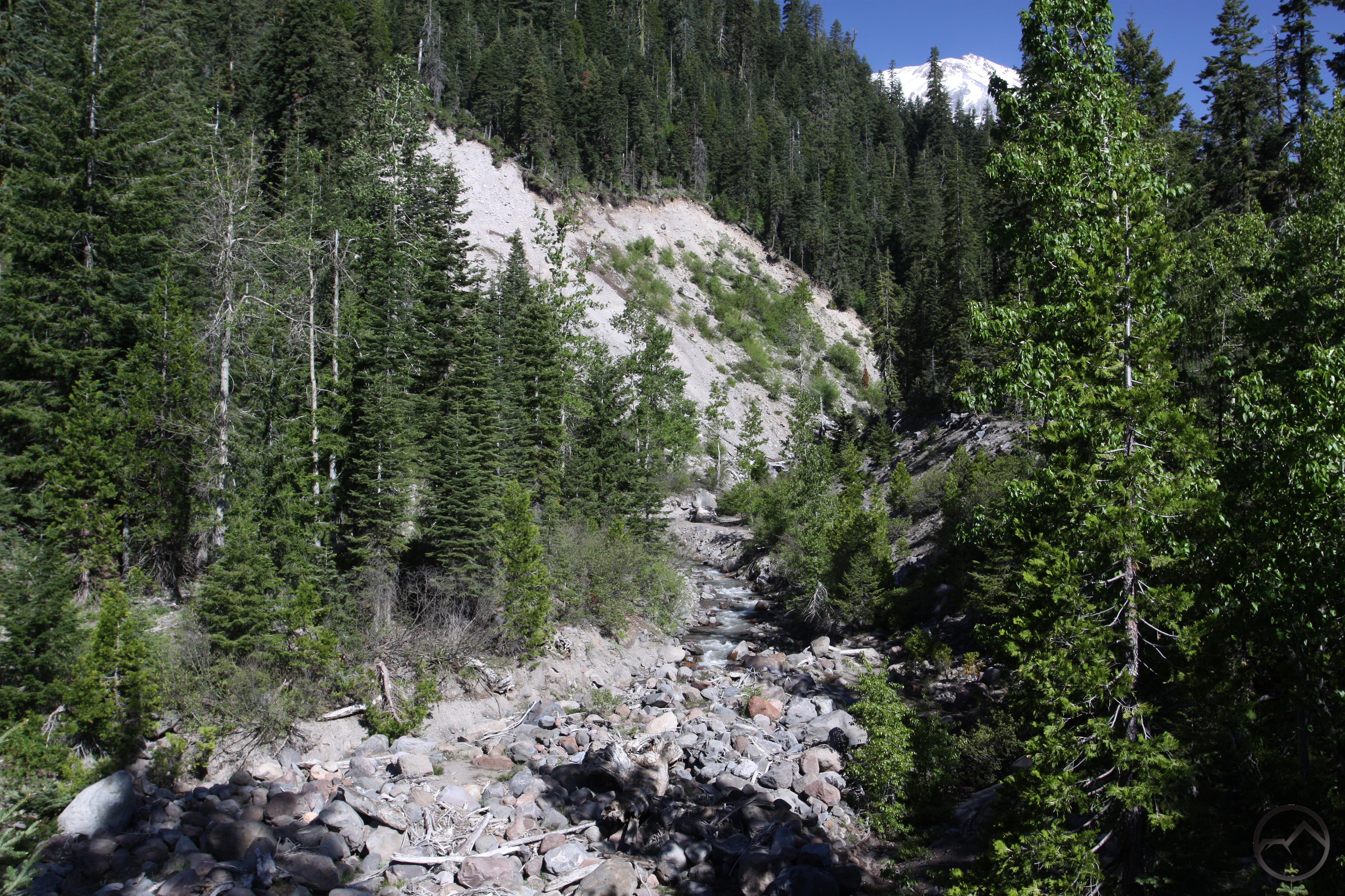 - Mount Shasta peeks out above the lowest section of Mud Creek Canyon.