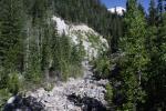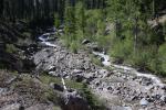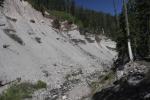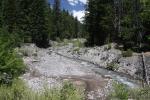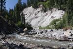 Without doubt, the most interesting feature in lower Mud Creek Canyon is Mud Creek itself. The creek runs all year and is, along with Squaw Valley Creek, one of the two largest creeks that begin on Mount Shasta. Its character resembles its distant relatives, the large rivers that rise full-grown from the glaciers on the Cascade giants to the north like Mounts Rainier and Hood. On those grand mountains, rivers such as the Sandy, Zigzag, White, Cowlitz and Puyallup Rivers emerge from their similarly named glaciers and flow off their host mountain. Like those river, Mud Creek begins its journey on the Konwakiton Glacier. Also like those rivers, its channel is wide and strewn with the detritus of Mount Shasta that has been carved off by glacial activity and subsequent erosion. Also like those rivers, Mud Creek does not flow clearly and is clouded by glacial flour and other bits of Mount Shasta as it slowly grinds away at the mountain. While much smaller than the aforementioned rivers, Mud Creek is still a large creek and its channel is cut deeply into the canyon. In fact, the river has a secondary course within the primary channel. The main channel is 20-30 or more feet deep and composed of the boulders and loose silt Mud Creek has washed off of Mount Shasta’s higher flanks. Within that channel the creek winds and weaves its way through the rocks. Numerous cut banks add a rugged and evolving beauty to the creek and canyon. Mud Creek is quite wild and very attractive and its character is entirely different from the other large creeks in the Mount Shasta area. For this reason alone lower Mud Creek Canyon is worth exploring.