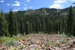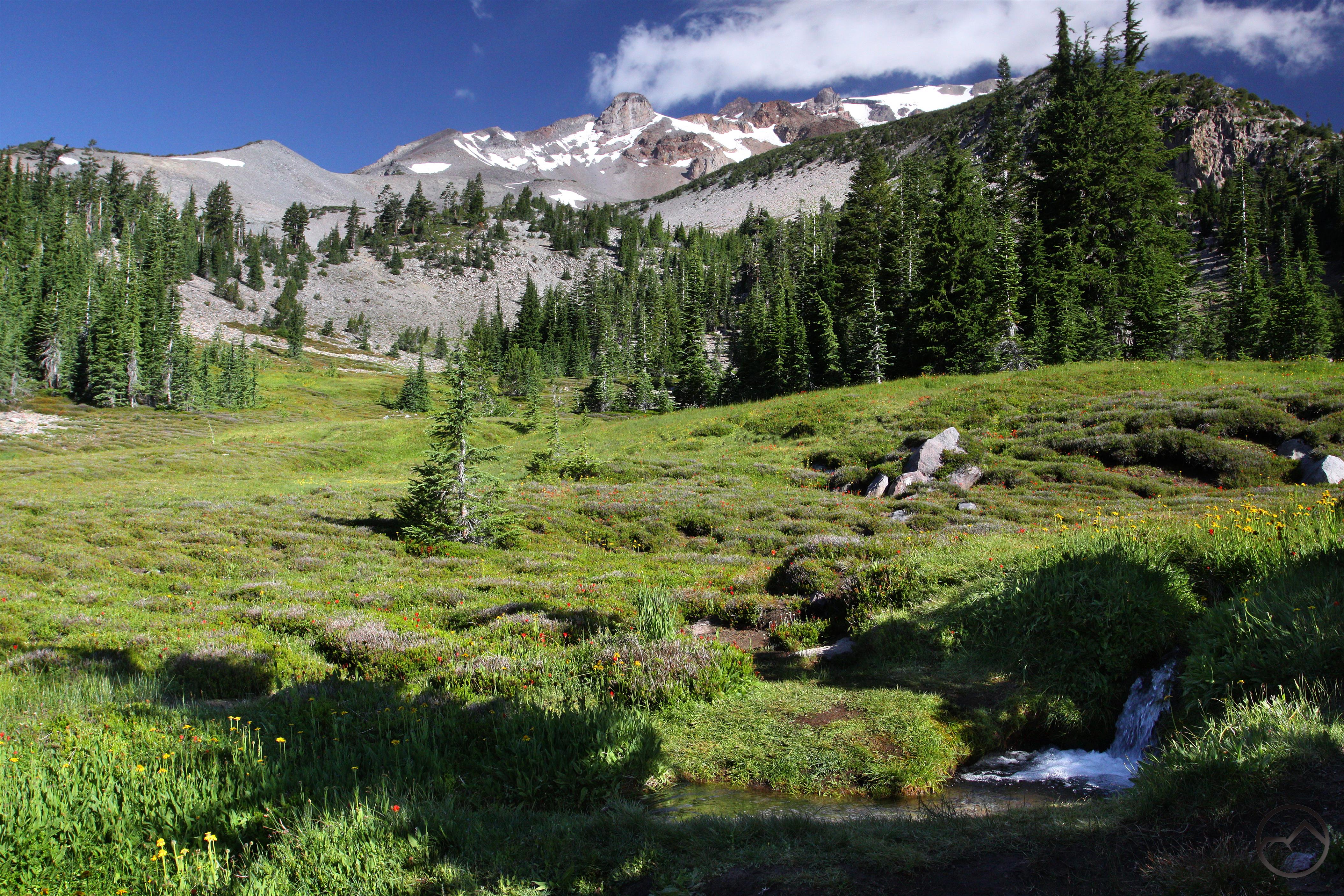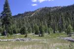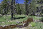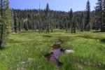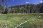 Located just north of the South Fork of the Sacramento River, Fawn Creek Canyon is a lonely mountain valley. Sandwiched between White Ridge to the North and Bear Ridge to the south, the canyon is blanketed in an excellent forest of lodgepole pine. Neither ridge is exceptionally rugged but they do claim some craggy protrusions breaking through the forest. The lowest part of the canyon is narrow and rugged as it approaches the South Fork. Fawn Creek tumbles down a series of small cataracts as it speeds through this section. The upper portion of the canyon takes on a much different appearance. Exhibiting the classic u-shaped form of valleys that have experienced the passage of large glaciers, it is easy to imagine a large sheet of ice gouging at rocky protrusion and leaving a uniform landscape in its wake. Although there are no lakes in Fawn Creek Canyon (often the remnants of glaciers) there is still a large complex of meadows in the upper section. The meadow is broken up into three sections. The lowest of the three is the least extensive and is intruded by numerous trees. The middle meadow is very attractive and has some nice views of rocky points along the rim of Bear Ridge. The upper meadow is by far the nicest. It is incredibly lush and it is possible to observe Fawn Creek developing as small spring-fed streams combine and begin the journey down to the South Fork. The upper meadow is hemmed in by the headwall of Fawn Creek Canyon, which, while not particularly craggy, is still a scenic sight from the lush grasses. Add to this mix some great wildflower displays in the meadows and Fawn Creek Canyon can be an idyllic mountain hiding place.