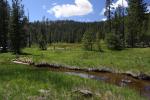 Access to Fawn Creek Canyon is not difficult. A road climbs up from the South Fork and passes the lower two meadow areas before stopping short of the final, upper meadow. The obscurity of the canyon is protected in large measure by the obscurity of the road and the numerous other attractions in the South Fork area. The road finally ends near the middle meadow at a large turnaround. The road actually continues beyond the turnaround but it has been condemned and quickly decays to an unpassable state. Nonetheless, the old road makes a convenient trail to hike up to the upper meadow. Though the road crosses a few wet spring areas, it stays a fair distance away from Fawn Creek. Nonetheless, the road and creek do approach each other as the meadow approaches and after a short cross-country jaunt, the meadow unfolds beautifully at the head of the canyon. Few people make it up this far into Fawn Creek Canyon and it makes a wonderful place to pitch a tent and enjoy a remote, wild and serene meadow.