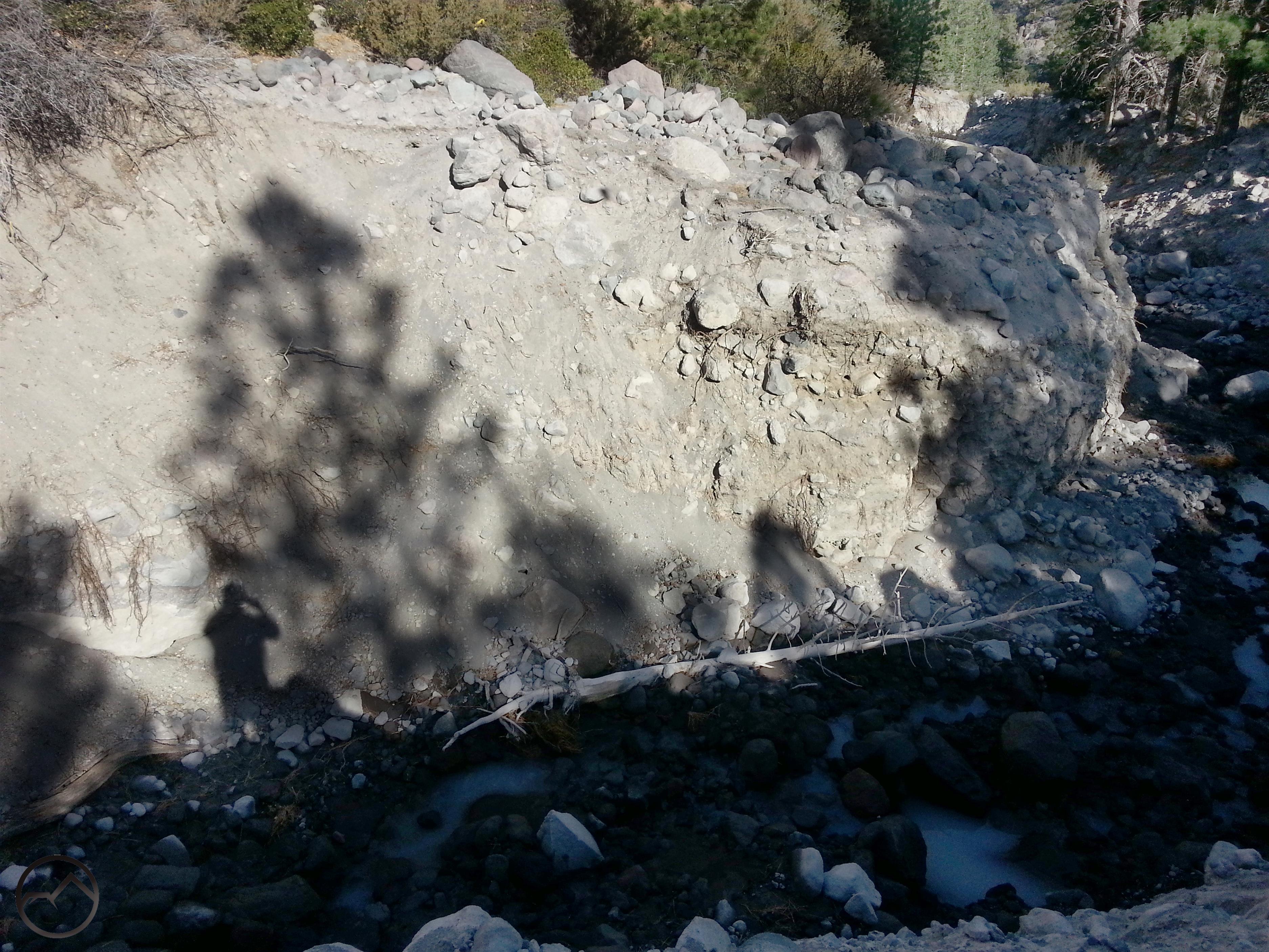 The crossing from the opposite side. Obviously this is not a viable option for the trail anymore. The walls of the channel are loose and unclimbable.