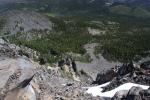Another interesting feature of the rock glacier is the presence of lakes. Ash Creek Butte claims two and it is surprising that they are not more popular destinations for hikers. In geologic terms, the most interesting is the tiny lake at the foot of the glacier. It is common to see lakes form at the point where glaciers terminate and though this lake is tiny, it is more evidence that ice once flowed like a river from the summit of Ash Creek Butte. Lacking a name, I have dubbed this small tarn Fossil Lake. Though it is small, it is unusually deep and makes a good place for a swim. The water is located right at the foot of the glacier and the rocky debris rises 50 or so feet high above the water. It is a lovely spot. The other body of water on Ash Creek Butte is beautiful Surprise Lake. Further down the basin from the glacier, it indicated how far the ice once extended. No trails lead to Surprise Lake but it is easy to get to. With sandy beaches, turquoise water and the rugged summit of Ash Creek Butte looming overhead, it is a wonderful place to relax and enjoy the deep isolation this area offers.