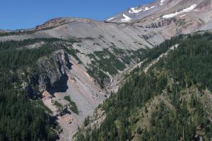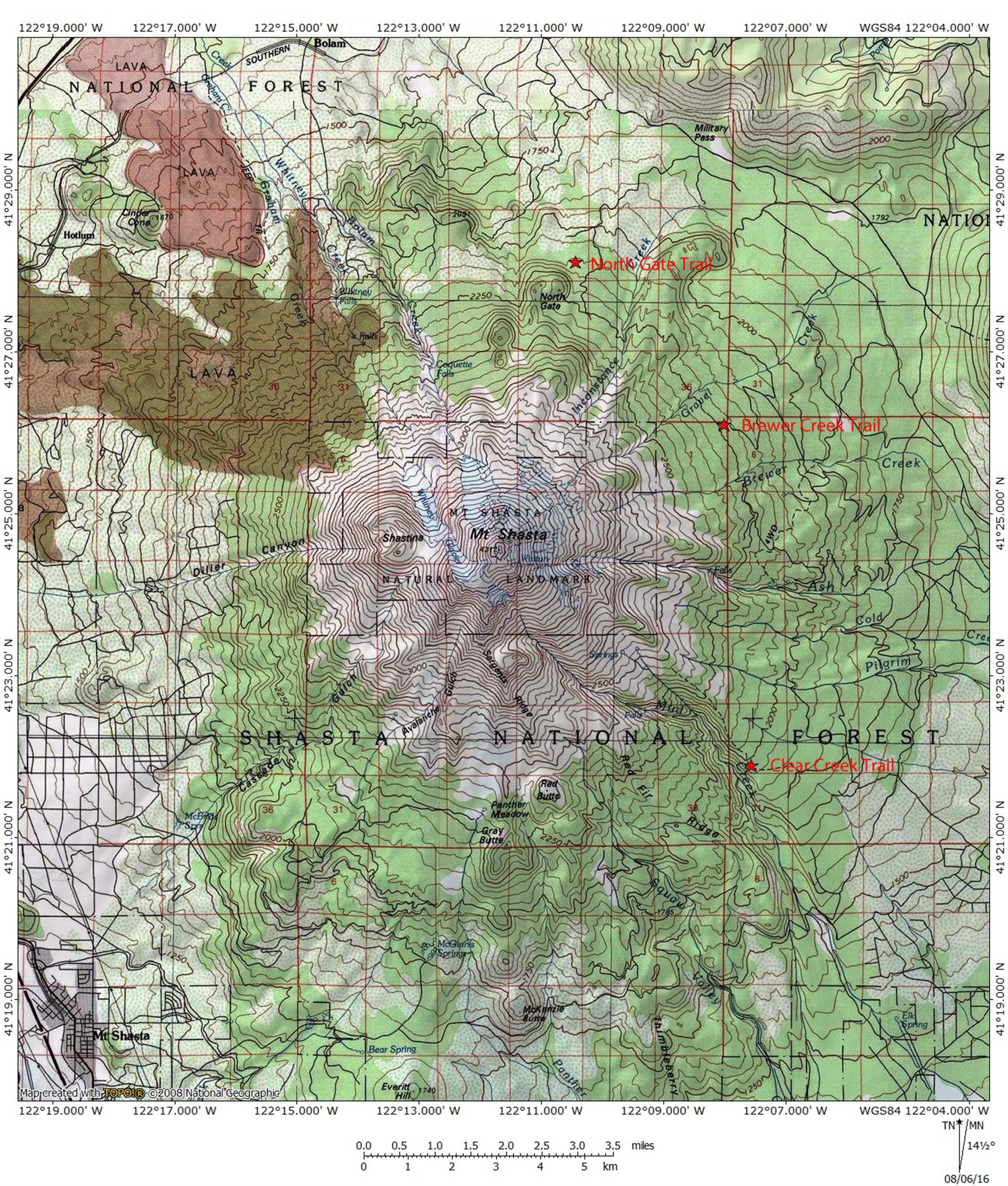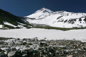 The southernmost of the three trails on the east side of Mount Shasta, the Clear Creek Trail is also the closest to civilization. This is relative, of course and it still see far less traffic than the trails on Everitt Memorial Highway. This path also leads to the only non-technical route to the summit of Mount Shasta. Most of those who hike the trail are headed up the mountain. For hikers who make this journey, views of stupendous Mud Creek Canyon await, as well as a beautiful basin that unfolds beneath a series of gigantic volcanic spires and a pair of cluster of small glaciers. The trail ends at the serene Clear Creek Springs, where there are lush meadows. The trail initially climbs through old growth red fir forest but eventually begins a steady ascent along the east rim of Mud Creek Canyon. There are a few incredible views of the mountain high above the great chasm. Awesome Mud Creek Falls is also a highlight of this area. Eventually the trail climbs above the treeline and enters the vast bowl that lies beneath the Mud Creek, Konwakiton and Watkins Glaciers. Shastarama Point, Thumb Rock and Misery Hill all line the very dramatic horizon. At the meadow, a series of springs erupt from the ground. Where the water flows, there is a thread of lush, green life amidst the starkly barren, yet beautiful, volacnic basin.