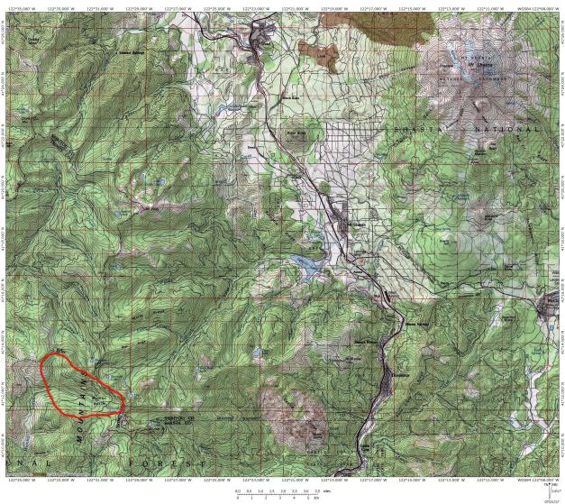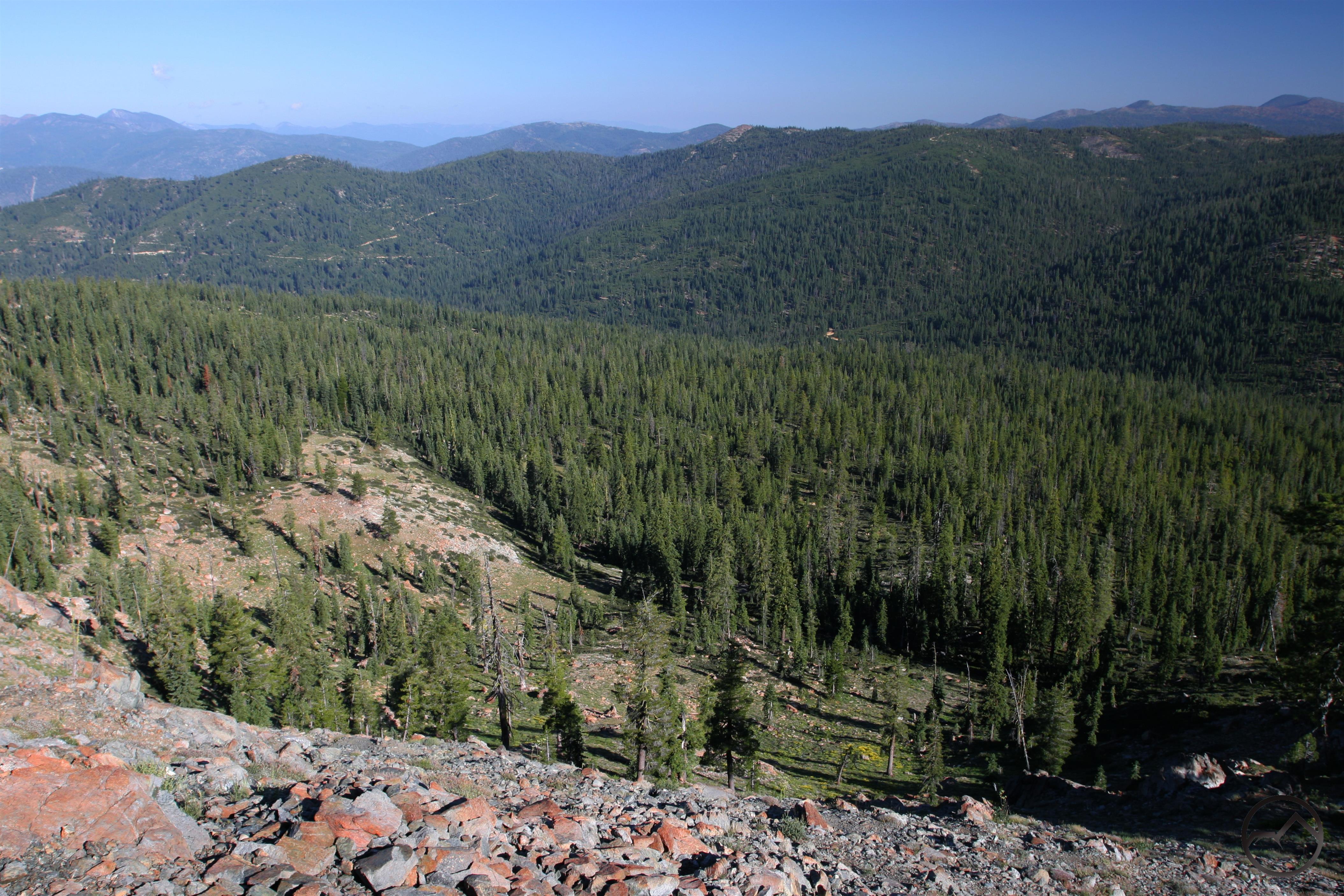 Though there are no really established trails, there are a few good options for adventurous hikers. The most trail-like option is the remnants of the old Blue Divide Trail. This was once a trail that descended from the crest of the Trinity Divide down to ridges directly above the main branch of the Trinity River. The trail has essentially been abandoned but many sections of the path are still extant and open to hikers. Following roads along the north rim of Mumbo Basin, it is possible to pick up the trail and proceed out to an overlook with spectacular views of the Trinity Alps, the Scott Mountains, Mount Eddy and Mount Shasta, as well as Mumbo Basin itself. The trail continues beyond the vista but the destinations become more ambiguous. Even when the Blue Divide Trail was a maintained path, this was one of the few trails on the western side of the Trinity Divide. Now, other than Deadfall Basin, there are none. Though the area has experienced a lot of logging, it would be nice to see some old trails rehabilitated or new ones built.
