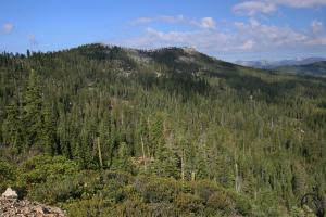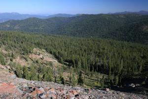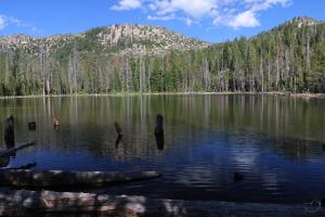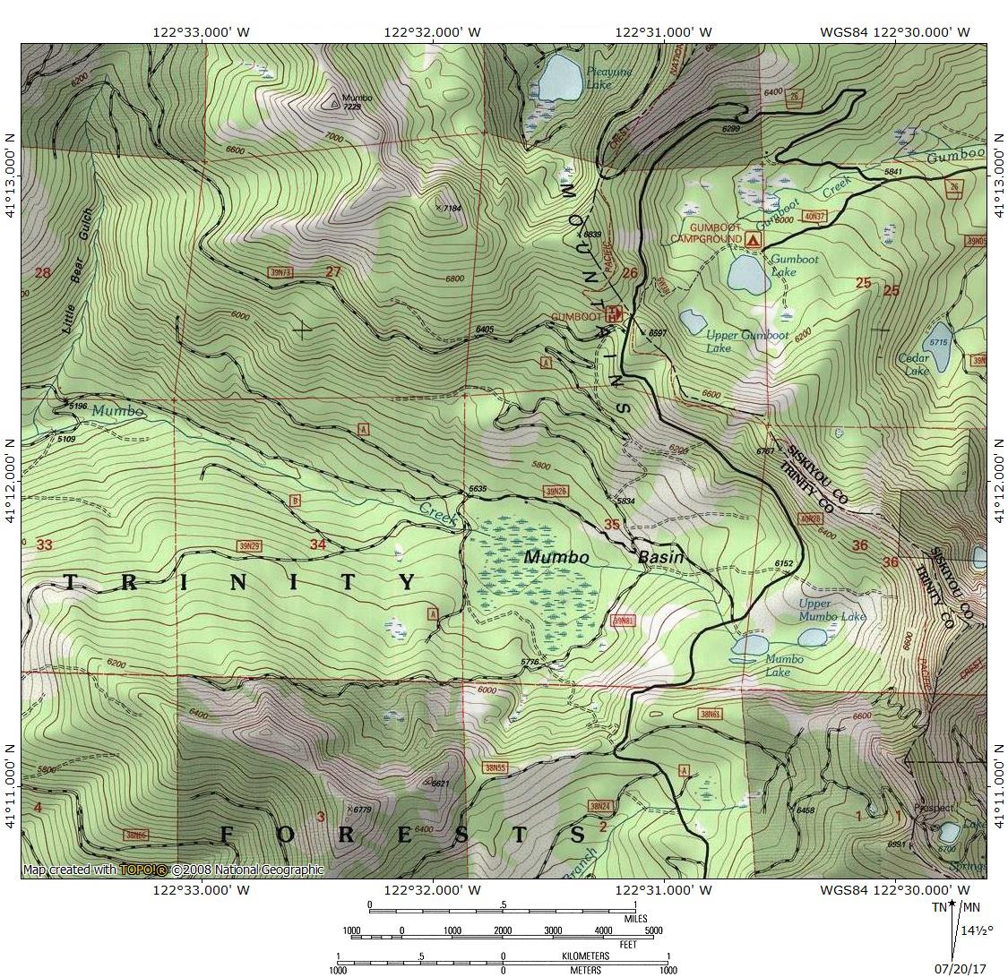 The lack of attention is due, no doubt, to the lack of established trails in the area. This should not preclude motivated hikers from venturing out to the west side of the Trinity Divide and exploring the ridges and roads that permeate the area. Most people who do head into Mumbo Basin do so to reach Mumbo Lake. It is among the smaller lakes in the Trinity Divide but it is easily accessible via the paved road just a short distance past Gumboot Saddle. It is a good lake for swimming and camping. Hikers comfortable with cross country travel can climb higher into the uppermost section of the basin and find shallow Upper Mumbo Lake. The rocky summit of Peak 7,149, also dubbed Many Lakes Mountain rises above the Mumbo Lakes, giving them a very scenic backdrop. The Pacific Crest Trail cuts across the flanks of this peak, high above the lake, which also offers great views of the basin.