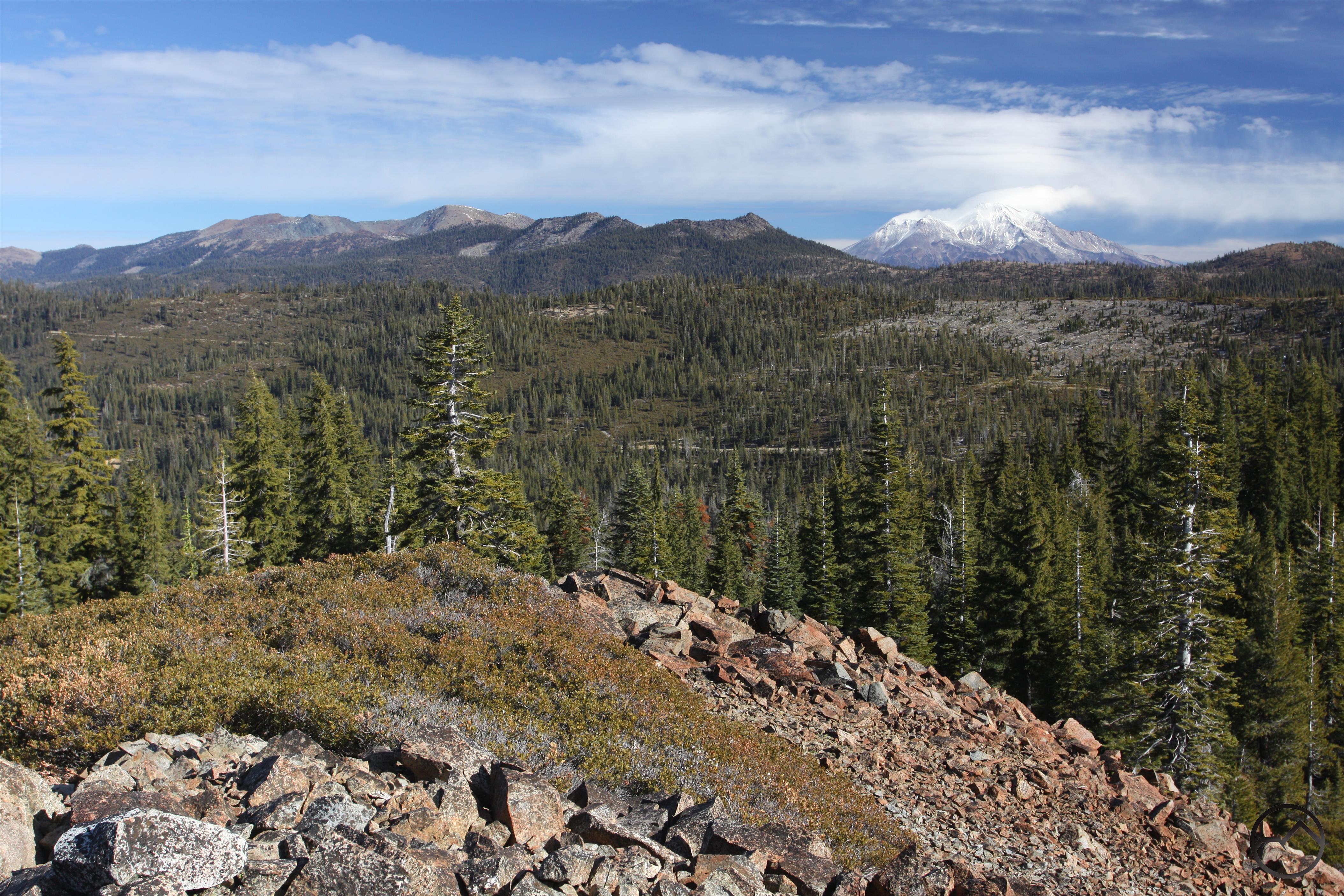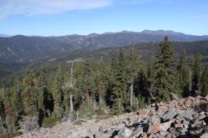 The other good option for hikers is the cross country scramble along a ridge on the south side of Mumbo Basin. This route has a very faint use trail at the beginning and then quickly becomes a simple scramble with no trail along the ridge. Fortunately, the terrain is pretty open and easy to follow and does not require much bushwhacking. Small meadows lie immediately below the ridge and hikers have good views of these as well the interior of Mumbo Basin. It also affords the unusual perspective of Mount Shasta rising above the crest of the Trinity Divide. The hike ends at the terminus of the ridge where there are incredible views of the Trinity Alps to the west. The nearest points of the Trinities lie just a few miles distant, on the far side of the Trinity River. Some of this hike crosses private timber land but passage is OK as long as there is no camping and no fires.