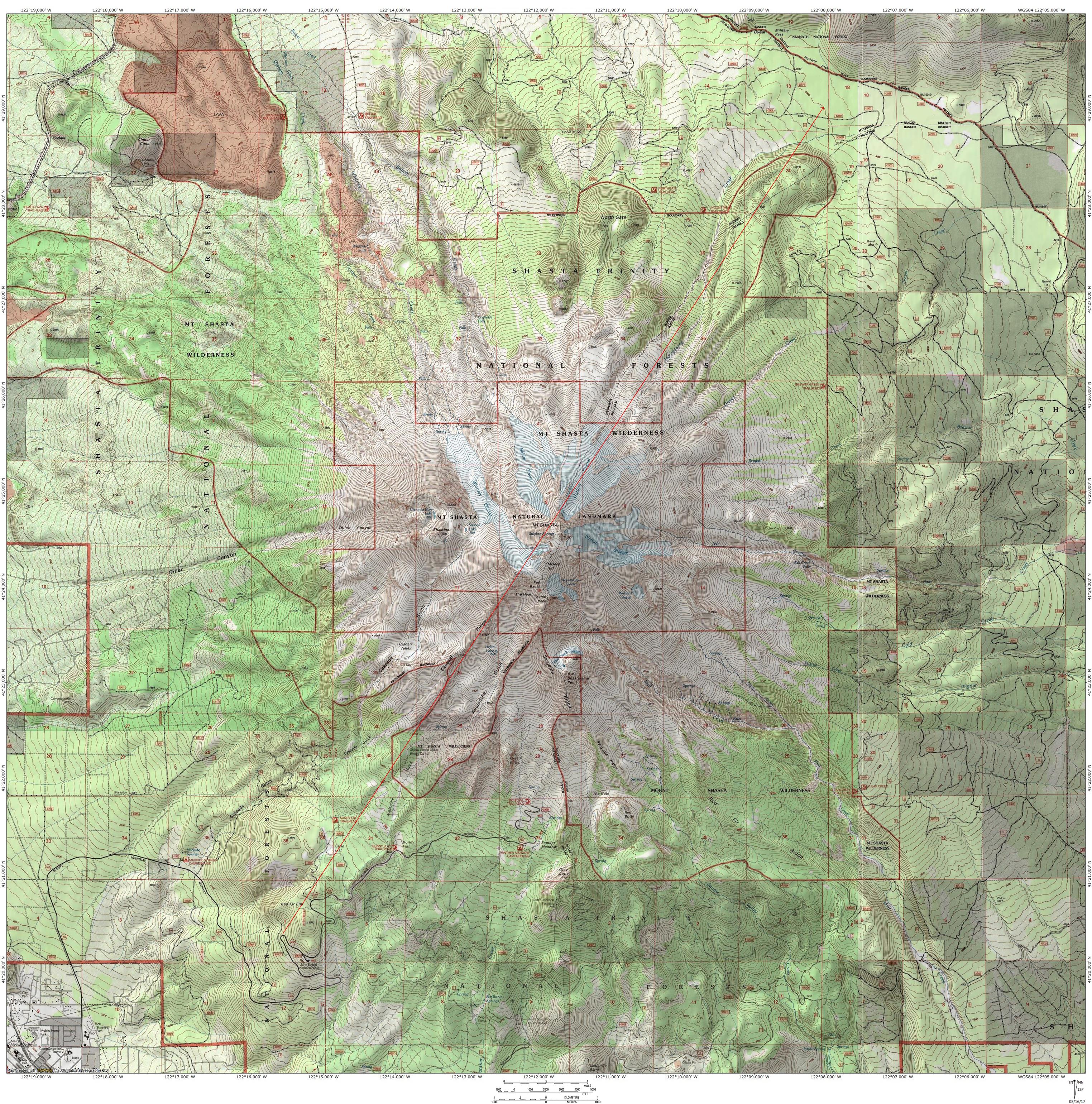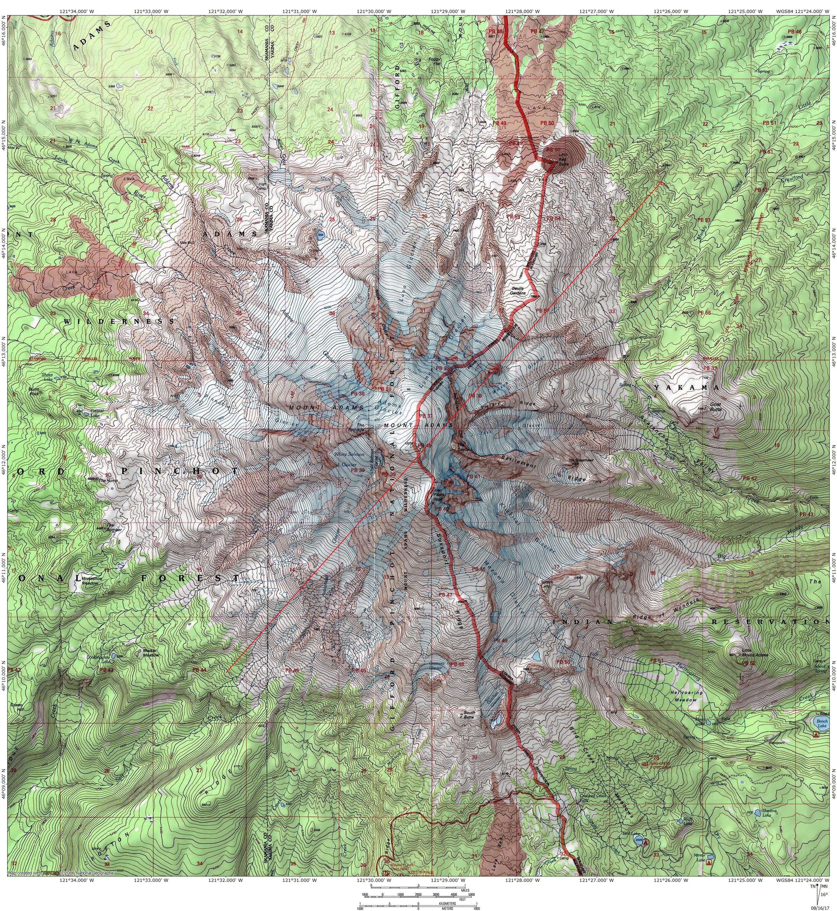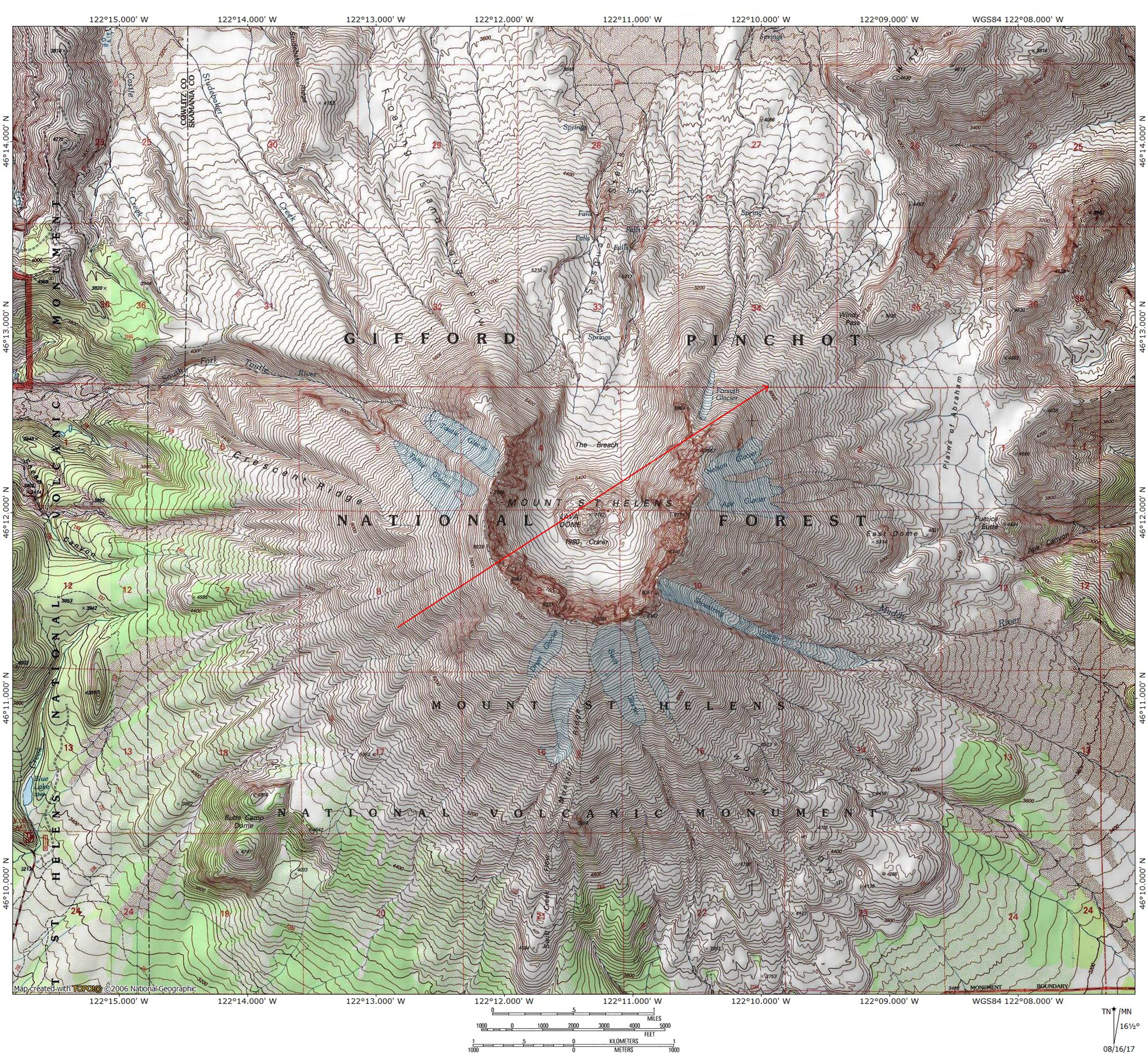 In light of this, I thought it would be interesting to compare the Cascade Volcanoes and how much area they have above the tree line. Since the tree line fluctuates, I picked 6,000 feet as a point of reference since it is at or near tree line at most of the big volcanoes in the range. I decided to begin at the southwest corner of each mountain since this is the position of the Everitt Vista, which is reference point on Mount Shasta. I measured each volcano from the 6,000 foot contour in the southwest to the 6,000 foot contour in the northeast. This way there is some degree in uniformity in what is being measured. The series of measurements begins with Mount Shasta, which is the baseline for comparison, and then travels north up to Mount Rainier, which is Shasta’s only real peer in the Cascades.