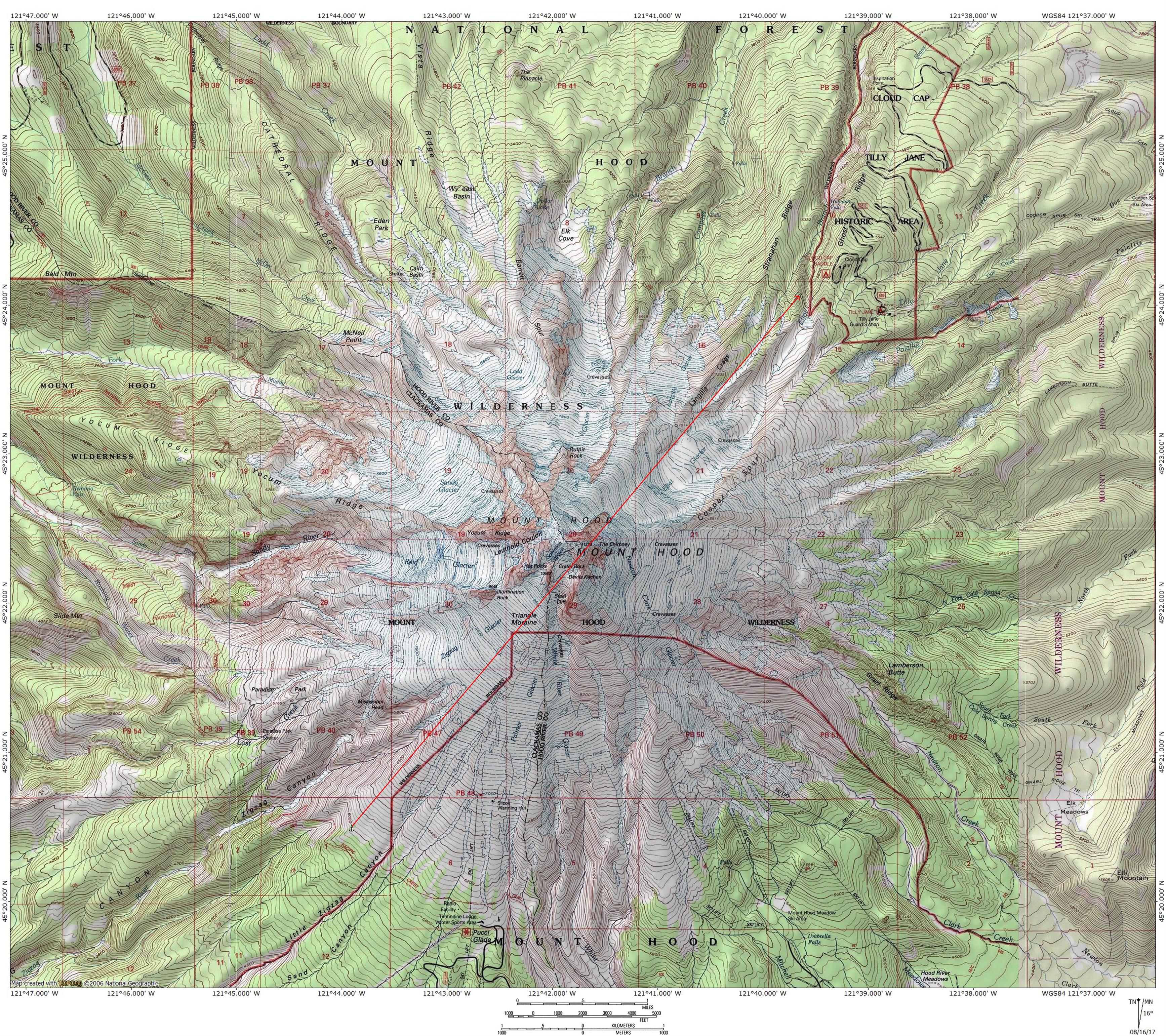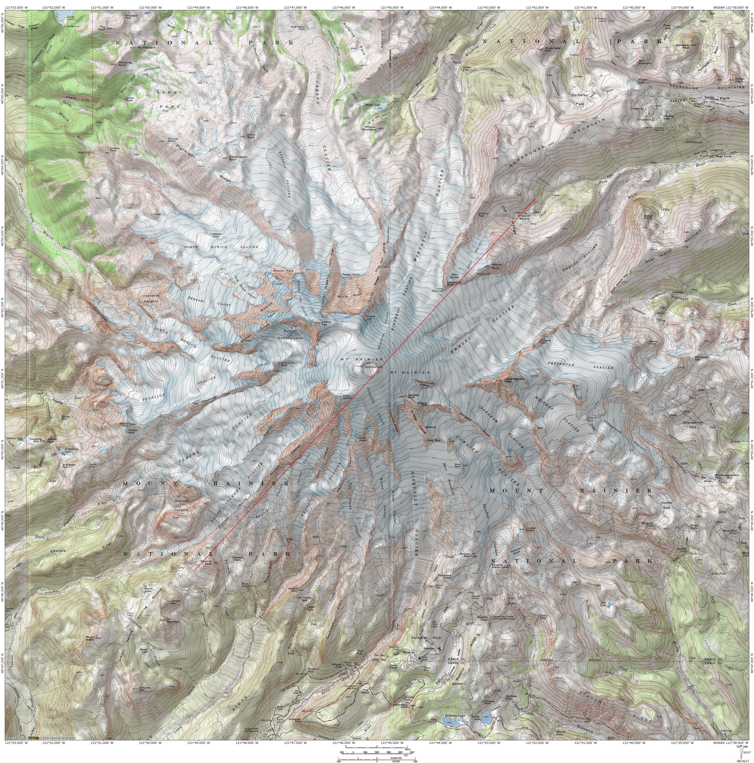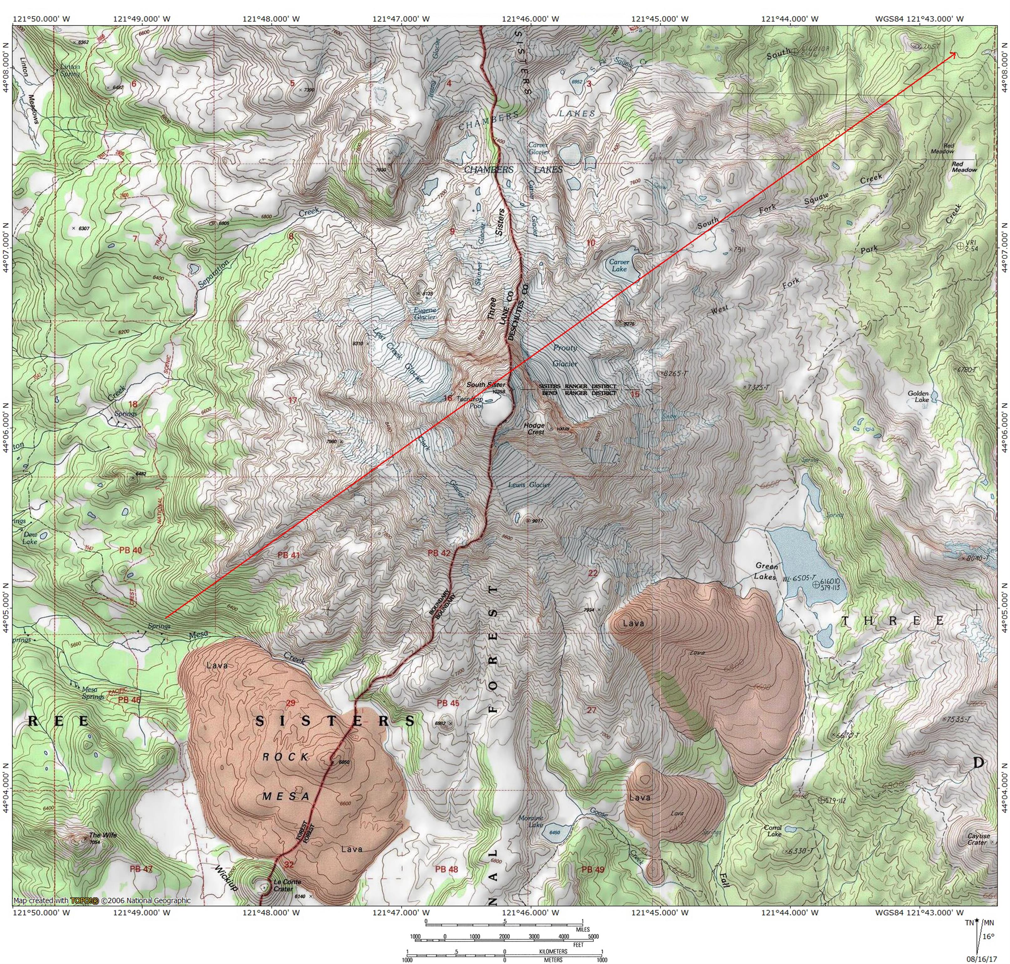 In light of this, I thought it would be interesting to compare the Cascade Volcanoes and how much area they have above the tree line. Since the tree line fluctuates, I picked 6,000 feet as a point of reference since it is at or near tree line at most of the big volcanoes in the range. I decided to begin at the southwest corner of each mountain since this is the position of the Everitt Vista, which is reference point on Mount Shasta. I measured each volcano from the 6,000 foot contour in the southwest to the 6,000 foot contour in the northeast. This way there is some degree in uniformity in what is being measured. The series of measurements begins with Mount Shasta, which is the baseline for comparison, and then travels north up to Mount Rainier, which is Shasta’s only real peer in the Cascades.