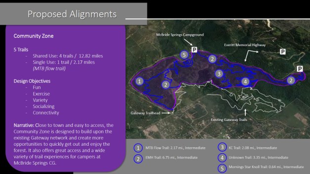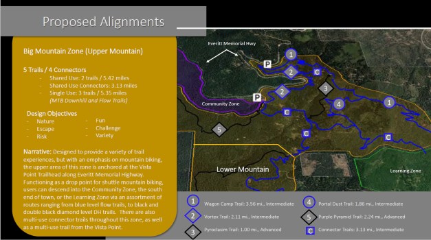 The entirety of the Phase II expansion is broken up into 3 sections (see above map). They have been dubbed the Community Zone, the Big Mountain Zone and the Learning Zone (with the possible renaming as the Discovery Center). Each of these areas has a different emphasis on use. I have broken out some of the slides from the presentation. A summary of each area as well as the proposed trails are present on each.