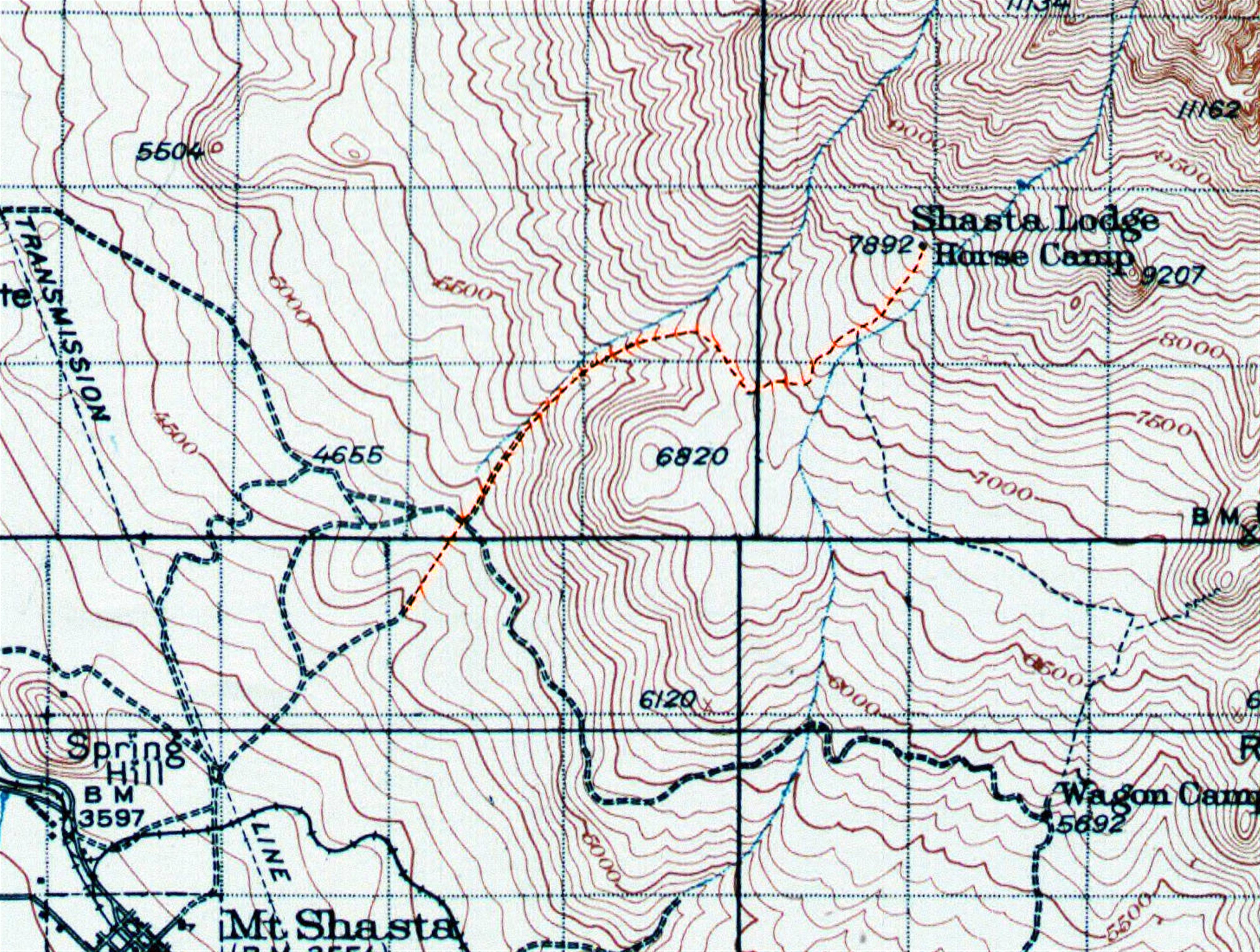 The South Sisson Trail, highlighted on the 1935 USGS topo map for Mount Shasta.