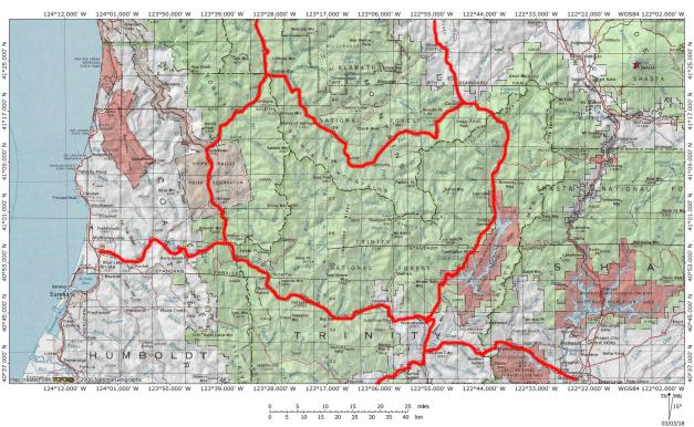 To put the wildness of this region into perspective, I like to make the point that, heading slightly southwest from Mount Shasta, there are only two paved roads between the area at the foot of the mountain and the coastal areas that surround Highway 101. The two roads, Highway 3 and Highway 96 are crossed at the eastern and western sides of the Trinities. The area in between them is wild, roadless and rugged. There are a few dirt roads permeating the Trinity Divide and the narrow strip of the Coast Range, but paved roads, the great mark of civilization, is an endangered species. Two paved roads between Mount Shasta and the coast, a distance of nearly 100 miles. There are few places in California, let alone elsewhere in the West, were such a great distance can be traveled and a paucity of paved roads will be found (or not found, as it may be).