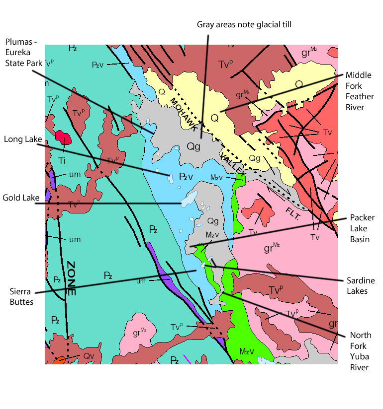 Most of the Lakes Basin area appears in light blue, which indicates quartz porphyry. The gray areas are the glacial till, grindings left by glaciers that carved out the basins. The turquoise area on the left is marine sediment. The pink denotes granite plutons.