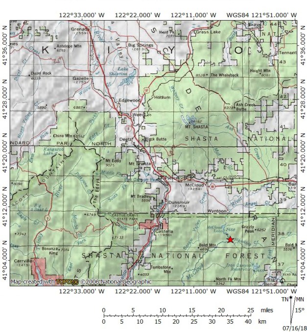 This section of the PCT generally follows the crest of a long ridge that runs from just north of the Pit River in an arc west toward Grizzly Peak and then down to the McCloud River at Ash Camp. It is possible to follow the PCT east from here to Butcherknife Creek but the more interesting hike is to follow the McCloud River west for a few miles. There are numerous place to drop down to the river (steeply sometimes) and some really nice, large cataracts that almost approach the level of being waterfalls rather than big rapids. The PCT eventually crosses a dirt road and begins a long climb up and over a ridge to Squaw Valley Creek. Instead of following the trail, hikers do best to turn left on the road and follow it about 0.5 mile down to the Ah-Di-Na campground. This area has good river access and some fascinating history.