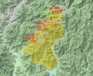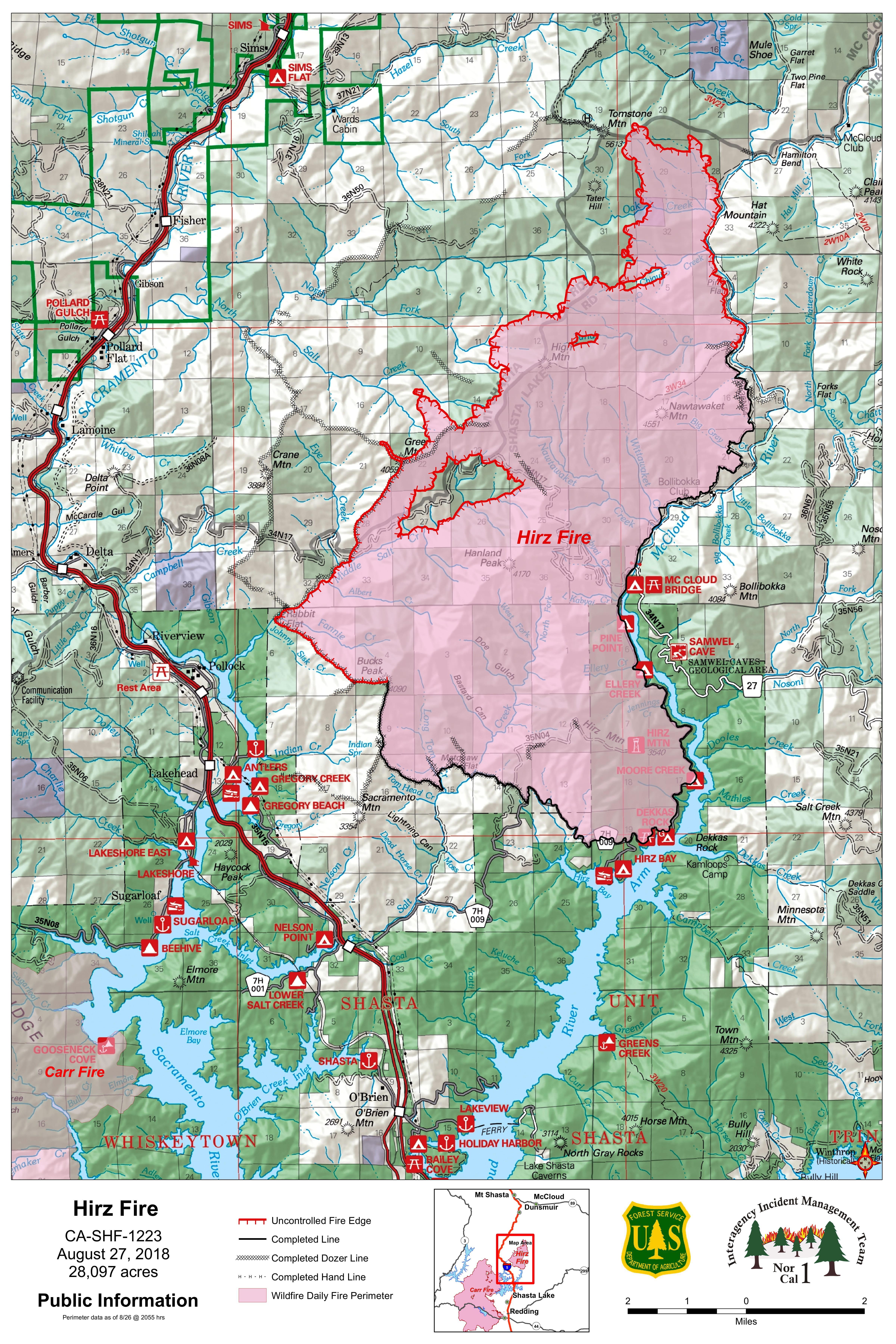 All of this raises the question about what is going on with the Hirz Fire. According to the news briefings, the fire lines are being cut in around Tombstone Mountain and along Middle Salt Creek. The map that accompanied the briefing indicate that further lines are being cut in along North Salt Creek. It seems like the fire is not moving with the kind of speed that made the Carr Fire such a monster. It seems as though the lines are holding and hopefully this thing will be in hand soon. Here is what the fire looks like at this time:
