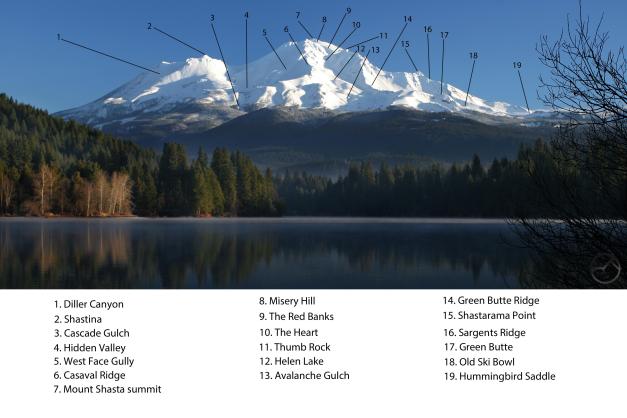 The impressive number of landmarks on Mount Shasta is indicative of the mountain’s complex geology. The fact is, Mount Shasta has experienced 4 distinct eruptive epochs, each adding a major quadrant to the volcano’s geography. This has heavily influenced Mount Shasta’s distinct appearance. Read more about these 4 eruption cones here. This article is an excellent companion to the Landmark Locator and helps explain many of the features identified there.