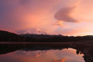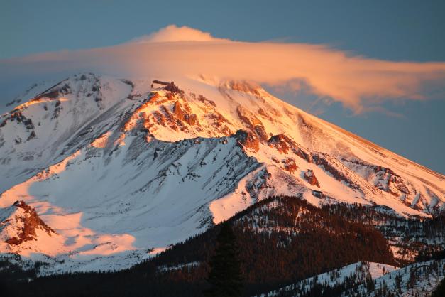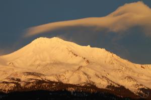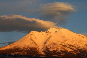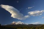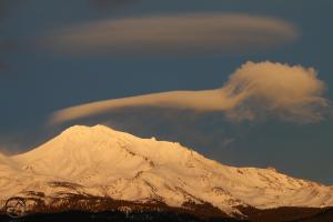 A stunning lenticular cloud coalesces around the summit of Mount Shasta.