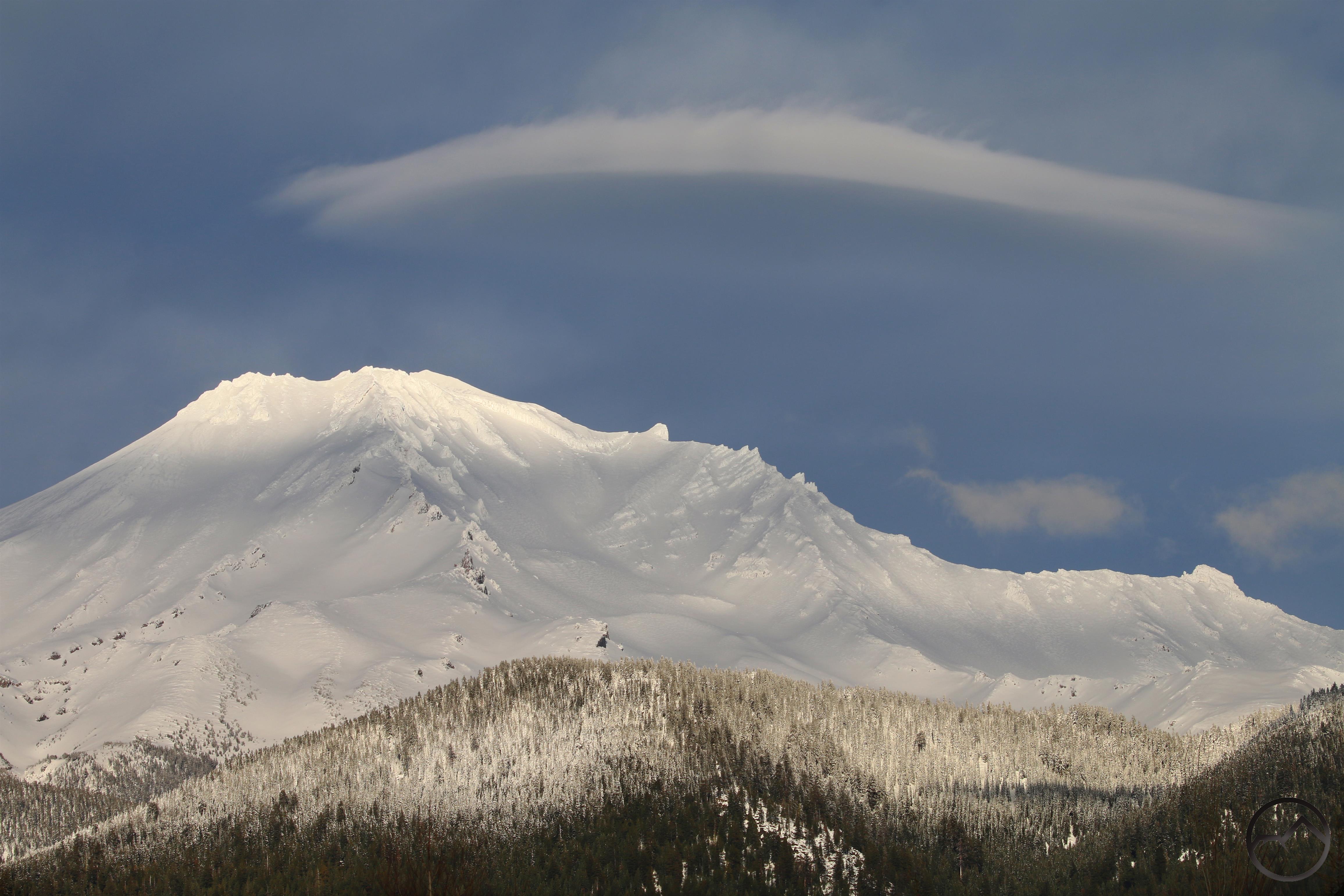 The storm that dumped snow and drenched the area in a deluge of rain having passed, today revealed a stark white Mount Shasta. Low clouds drifted through the area constantly and it wasn’t until the afternoon that the skies around the mountain really opened up, but once it cleared, the mountain glittered in the sunlight.