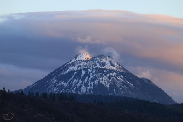 While all the other features were absent, Mount Shasta itself never fails to disappoint. In this case, the mountain was showing off its new snow with a billow plume being blasted off of Shastina. The plume itself was in Shastina’s shadow but it contrasted dramatically against the fledgling alpenglow that now drenched the higher flanks of Mount Shasta itself.