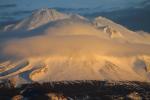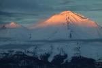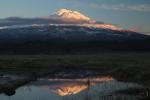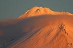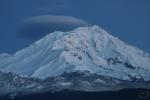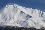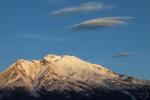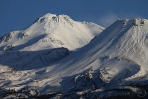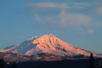 Clear skies and sunrise glow on snowy Mount Shasta.