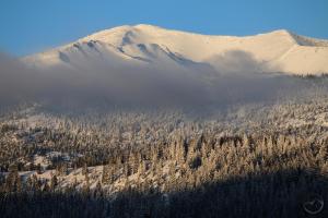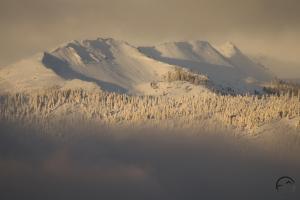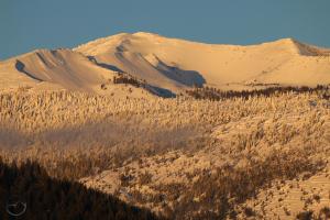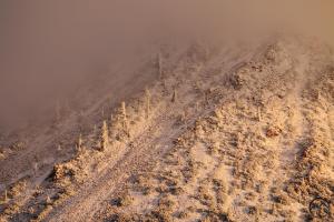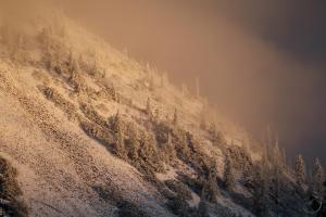 The warmer temps (relatively speaking, of course) of the last few days had raised the snow line and nothing below 5,000 feet seemed to have much snow on the trees. This was certainly the case on Black Butte, which seemed so be completely encased in rime ice, rather than snow.