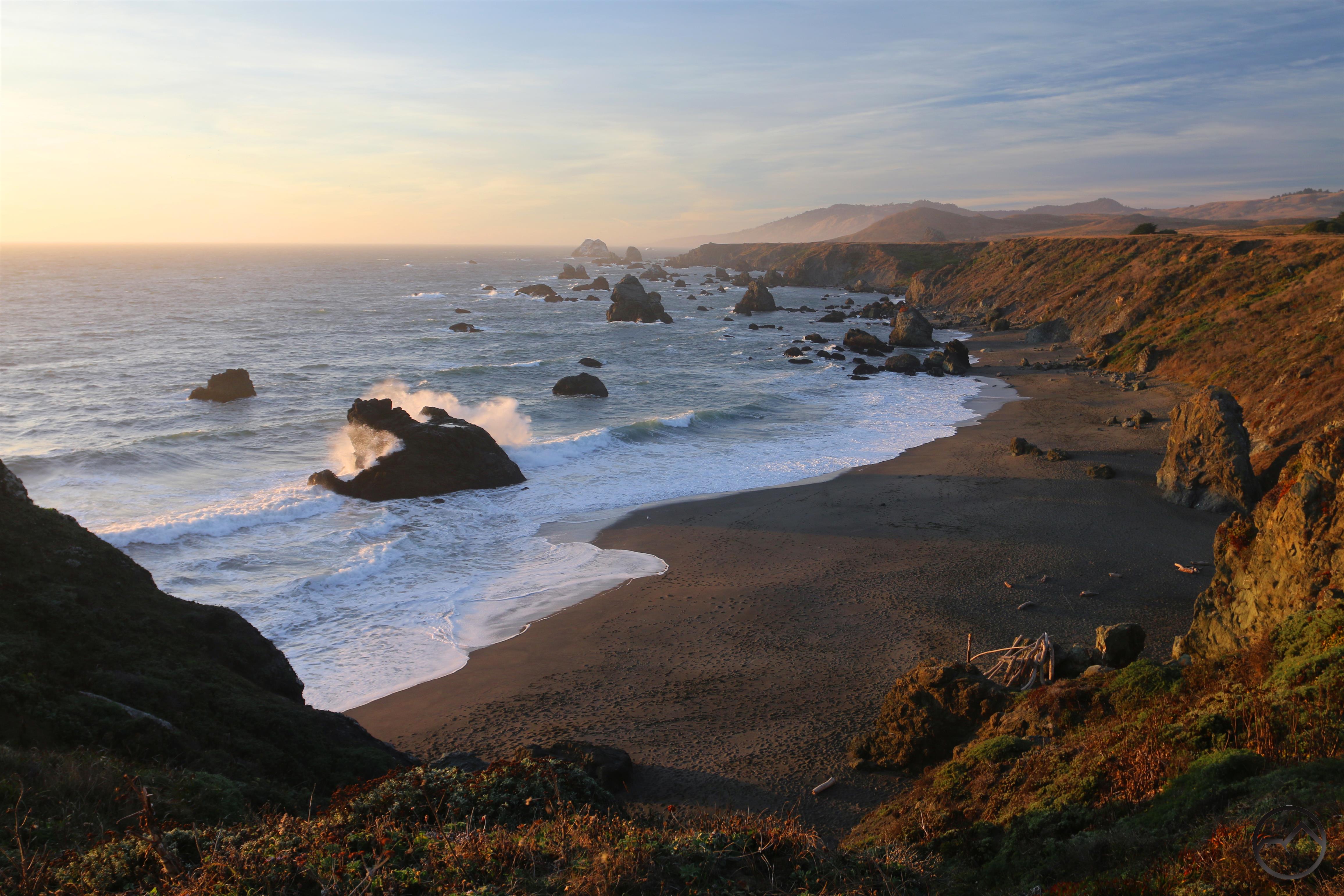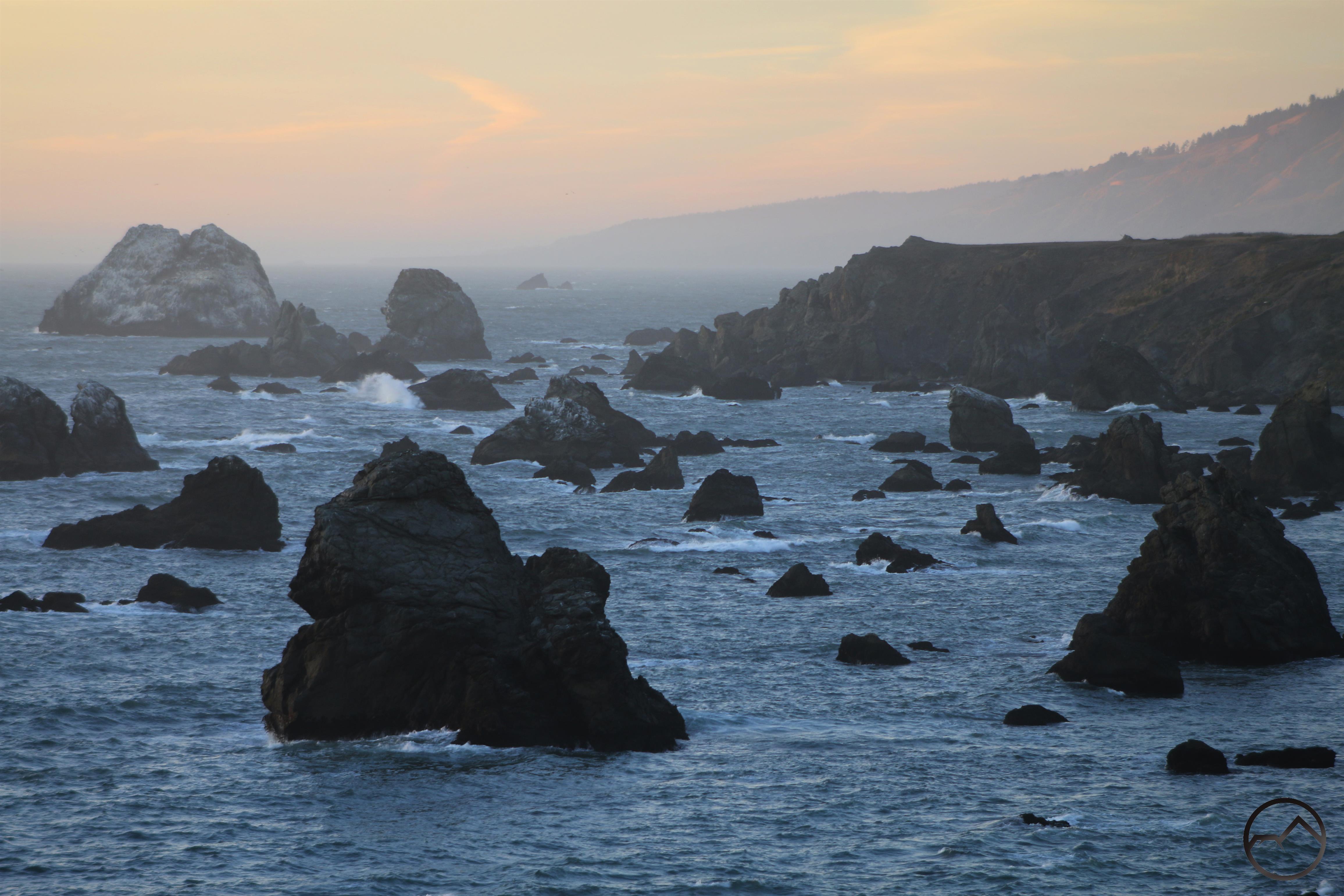 The coast of Sonoma County is at once subdued and spectacular. The more accessible areas lack the grand cliffs found at the Lost Coast and Big Sur but the presence of sea stacks gives it some fantastic drama nonetheless. Farther north the mountains along the shore increase in size but the number of parks and trails is fewer, though this area can still be enjoyed via Highway 1. One particularly interesting feature is Bodega Head, a large rocky finger attached to the mainland by a large sandbar. The head itself invisibly divided from the mainland by the San Andreas Fault. Consequently, the bluffs of Bodega Head are composed of granite, the only place in the entire county where such rocks are to be found in significant concentration.