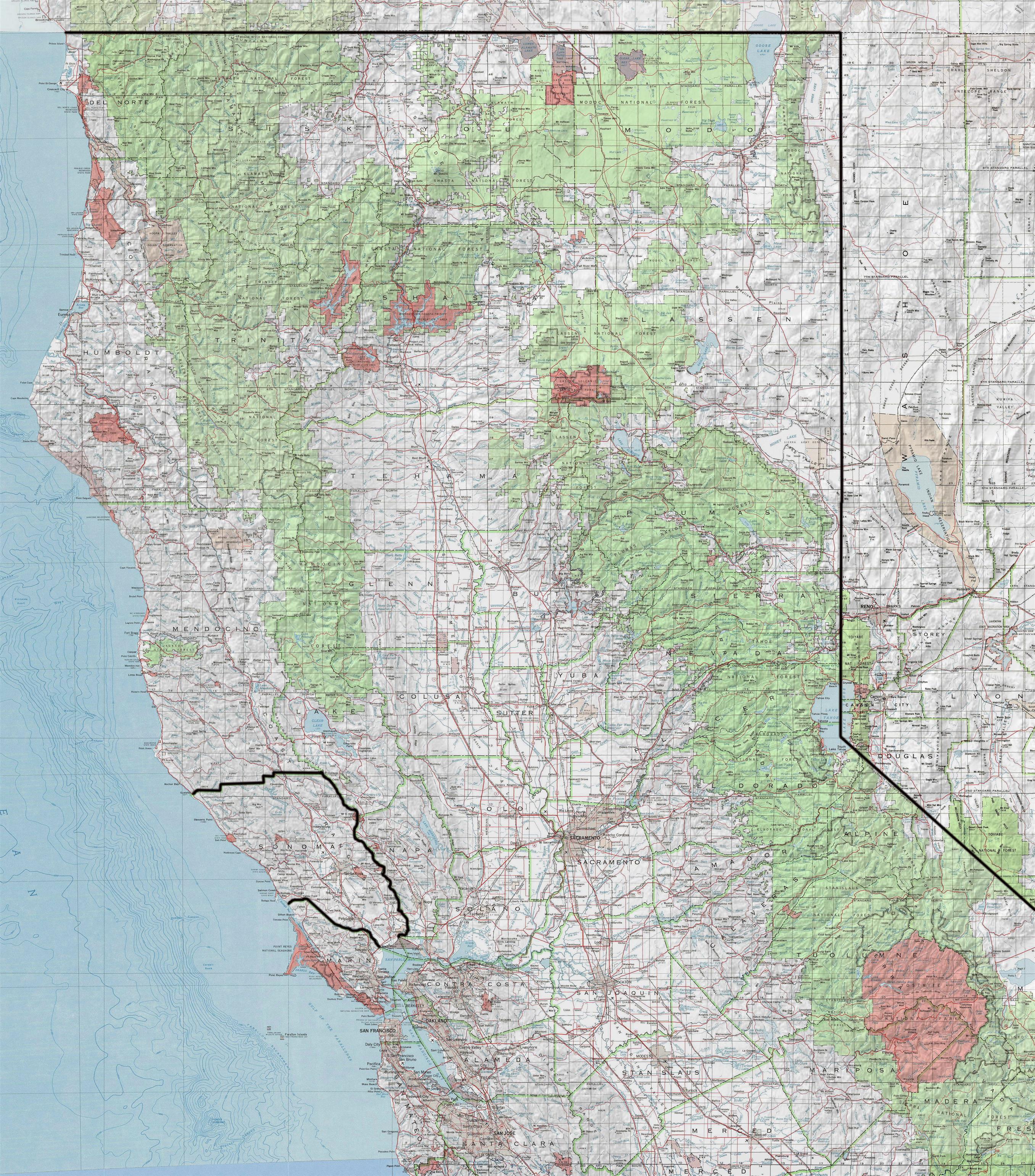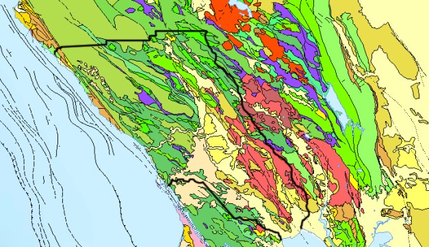 A rough outline of Sonoma County on the geologic map of California. The green areas are composed of sedimentary rock. The yellow is alluvium. The red areas are volcanic mountains.