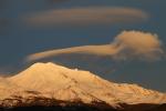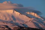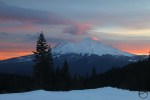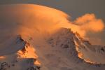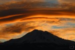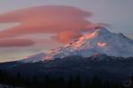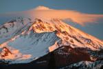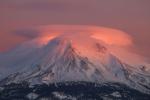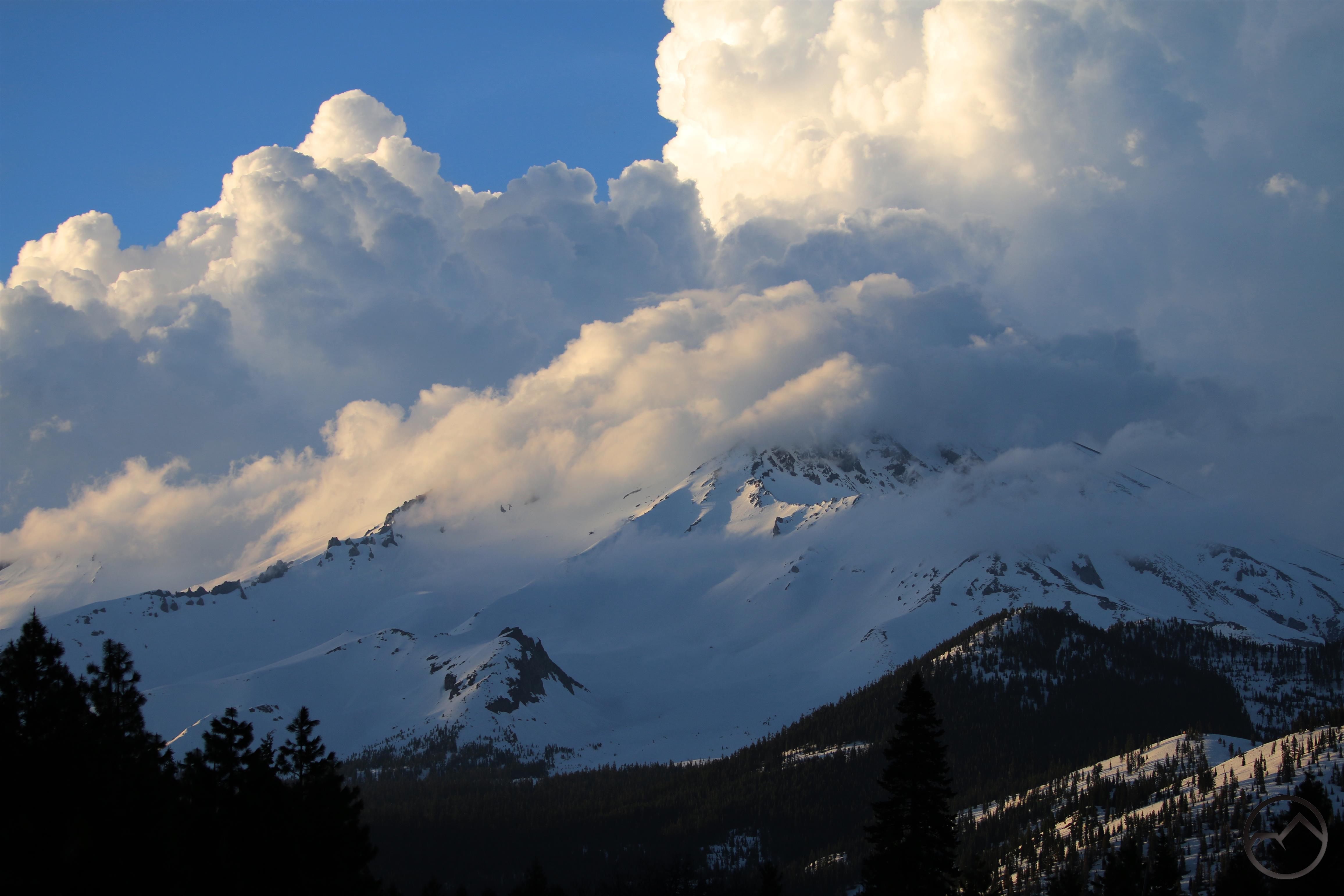 Spring thunderheads gather around Mount Shasta at sunset.