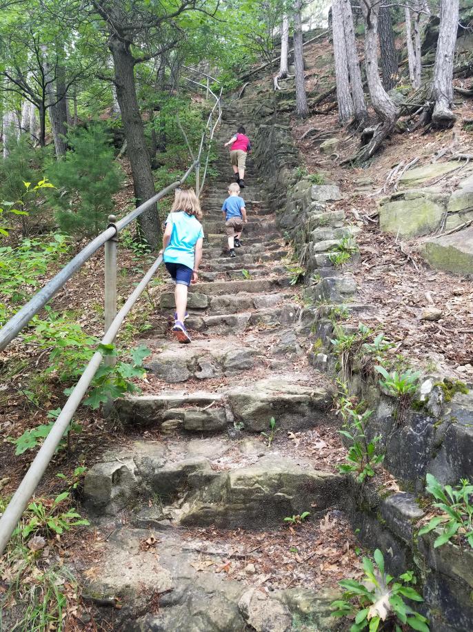 Climbing the Mill Bluff, a rare island of rough terrain in central Wisconsin.