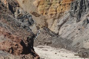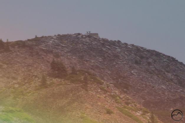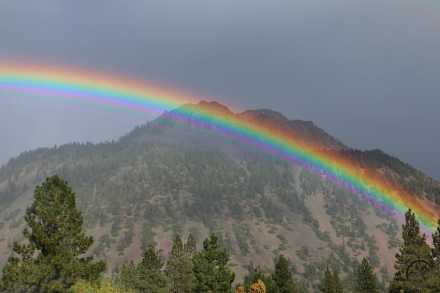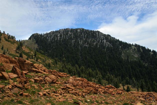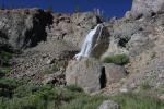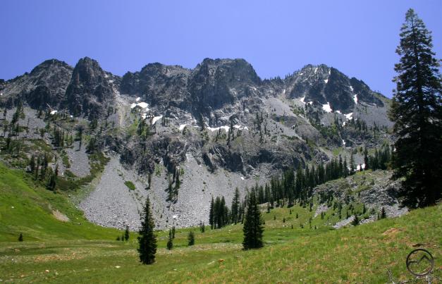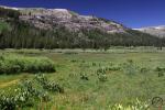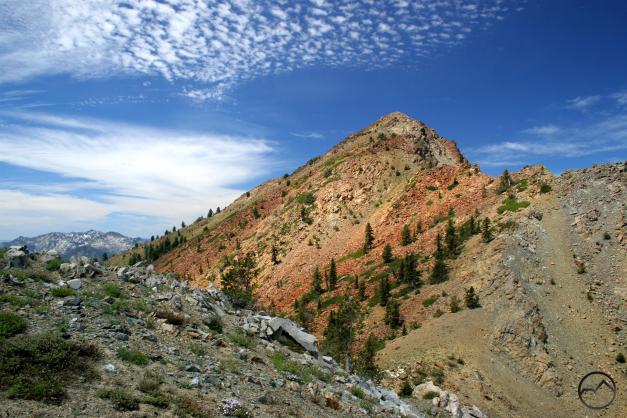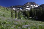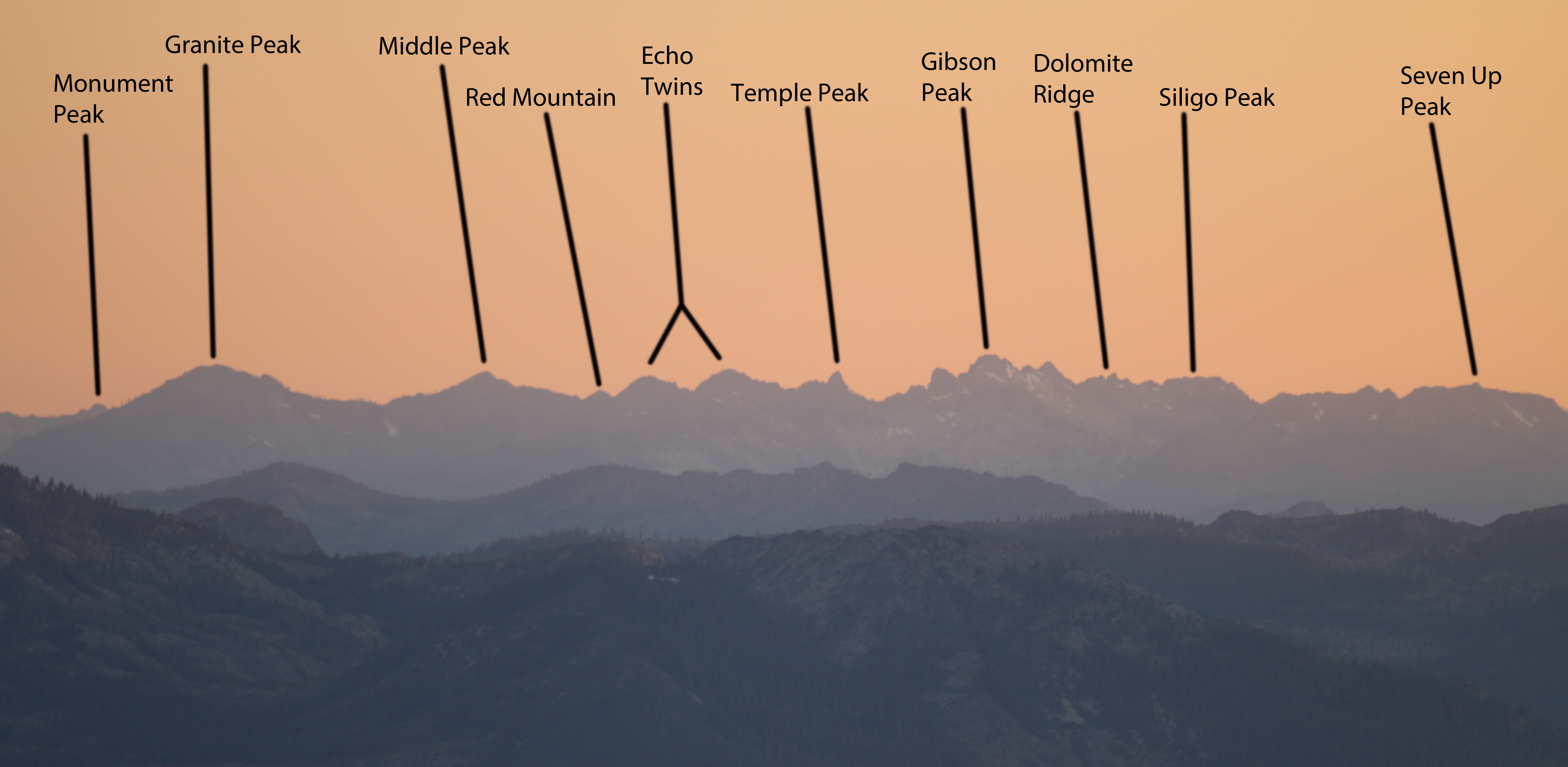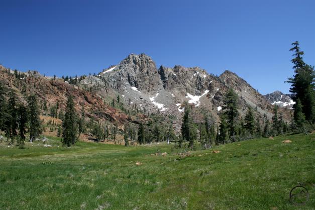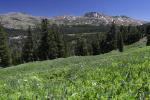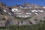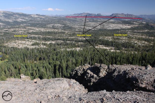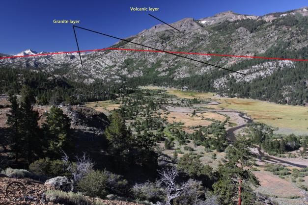 Here in Blue Canyon, which is located just west of Sonora Pass, the light granite layer is briefly visible beneath the dark rocks of Sonora Peak.