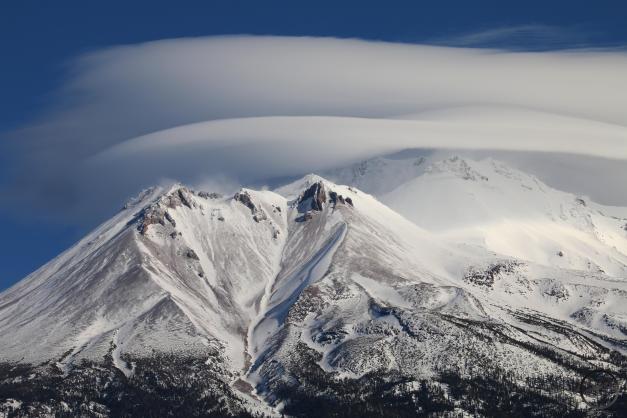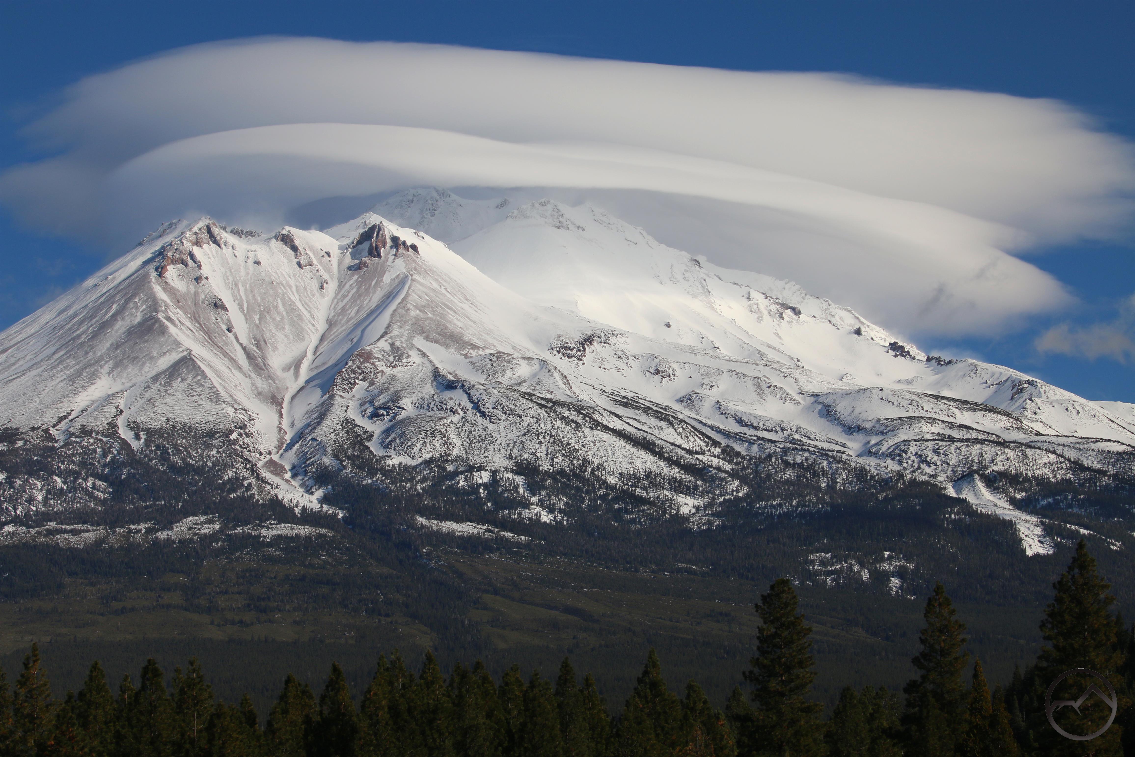 Though yesterday was actually a rather beautiful, sunny day, the forecast called for snowy weather by the evening. Furthermore, it was likely to be the last sunny day for a week, which meant a longer shift in weather patterns. The fluctuating systems yielded a lenticular over Mount Shasta which began to manifest around 11 AM. Within an hour it had gone from the barest wisps over the summit to a large single disk-like cloud. From there it bifurcated and developed into a pair of relatively stable large disks with a few smaller ones coming and going as the cloud swirled around the mountain. It was quite fun to watch.