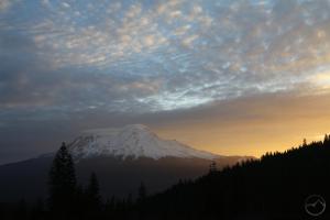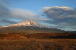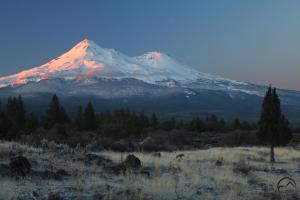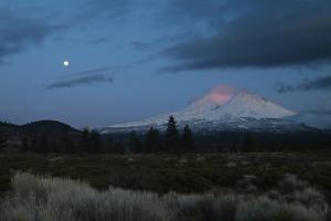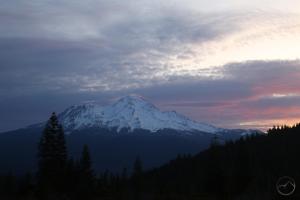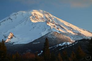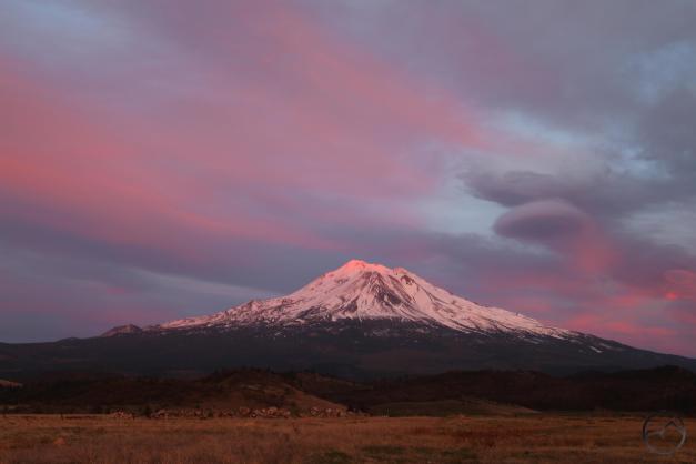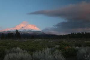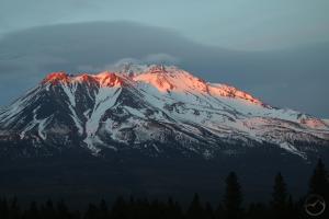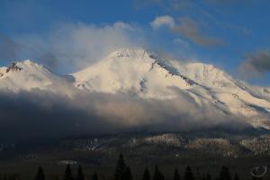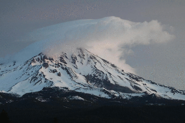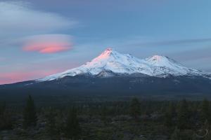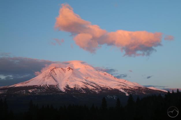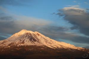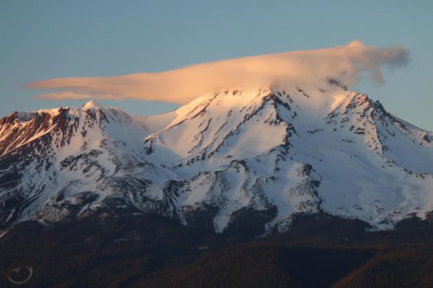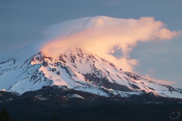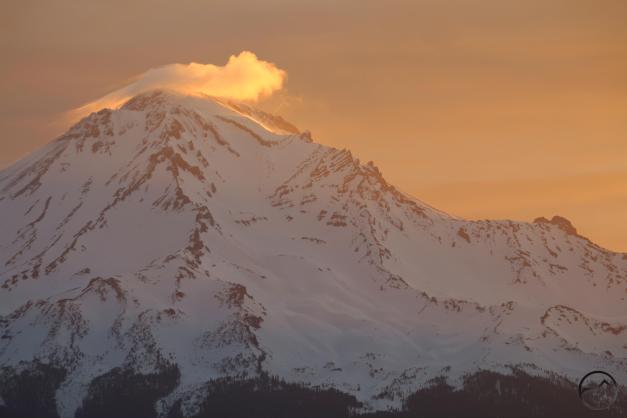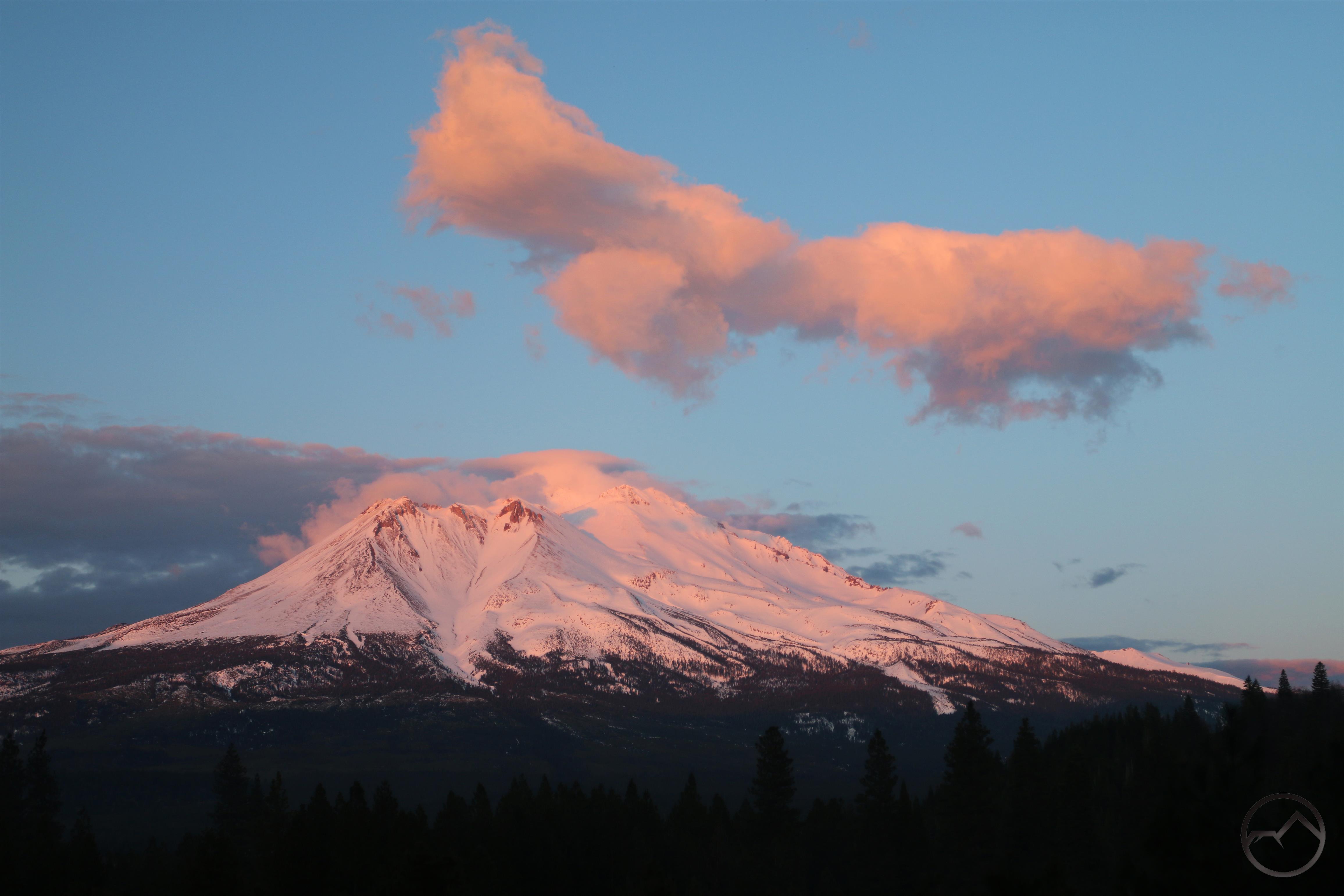 - A massive cloud covers the summit of Mount Shasta at sunrise.