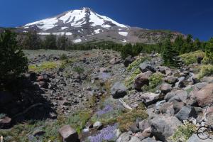 One of the most mysterious perspectives on Mount Shasta, due in large measure to Coquette Falls. Marked on topographic maps, this waterfall is the least known of Mount Shasta’s four named cataracts. Due to shifts in the stream bed, the original Coquette Falls has gone dry but now the water plummets over New Coquette Falls (sometimes called Bolam Creek Falls). The overall scene is incredible, with the Bolam Glacier-clad summit of Mount Shasta looming over the scene and the off-kilter bulk of Shastina rising like an unstable heap above the falls. Nearly 400 feet deep, Bolam Creek Canyon drops away below the visit point while wildflowers brighten the entire scene. It is a rarely seen and magnificent spectacle.
