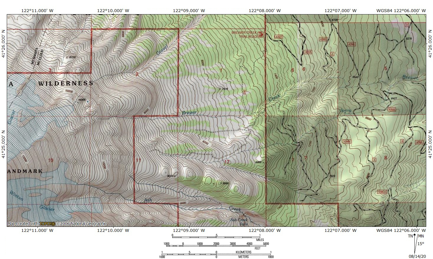 At about 350 feet high, Ash Creek Falls is the tallest waterfall on Mount Shasta and probably its most beautiful. While the falls is certainly the centerpiece of this view, Mount Shasta still overshadows everything else and draws the eye up towards the mountain’s summit. Between the falls and the summit is the upper half of the Wintun Glacier, California’s third largest. Downstream from the falls, Ash Creek Canyon falls away to the west. Over 300 feet deep, it is not quite impressive as the larger section above the falls but it is nonetheless a fine compliment to the entire view. This is said to have been John Muir’s favorite view of Mount Shasta.