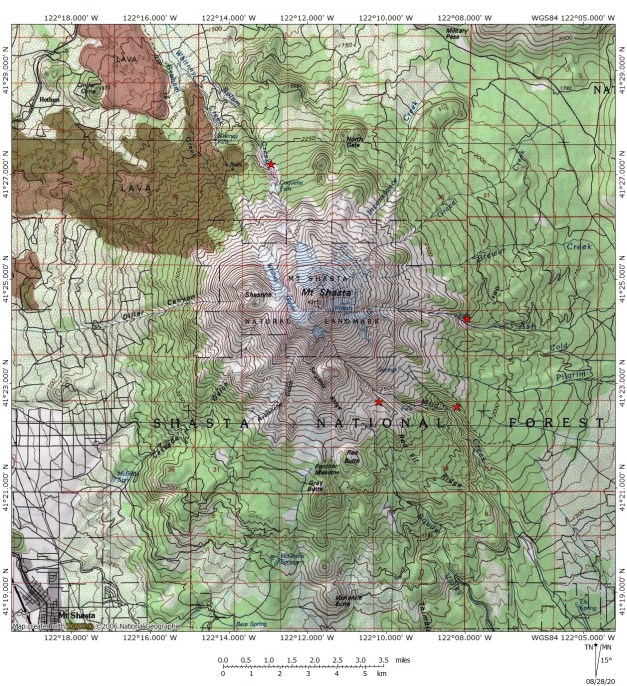 Three of the four vistas are on the southeast side of Mount Shasta and one is on the north. Though the southeast three are near each other, the mountain has very, very different visages from those three perspectives. The northern view features similar elements but looks even more different due to Shastina’s presence. I have will address the four counterclockwise from the top.