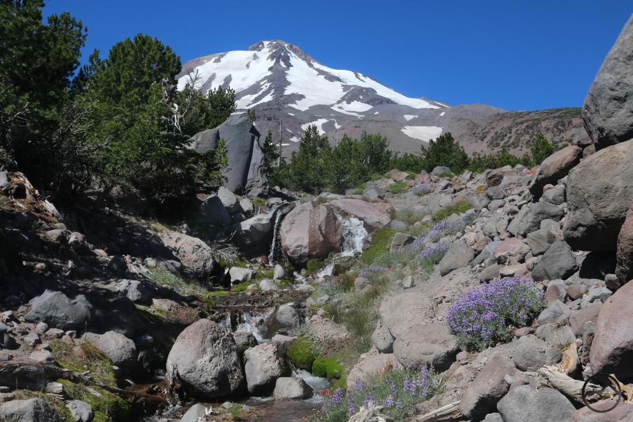 Not far from the trail, Brewer Creek leaps over a small waterfall. The crash of the water is audible above the sound of the creek. With the mighty mountain looming behind, it is a beautiful sight.