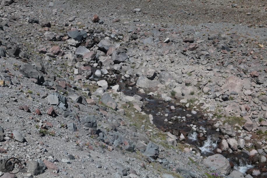 Initially, the creek flows above the treeline, with little vegetation around it.