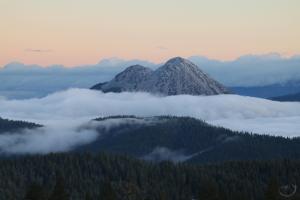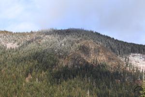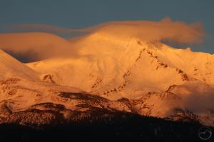 - A short time later, a different perspective on the mountain with the morning light. The cloud continued to hover over the summit, constantly changing.
