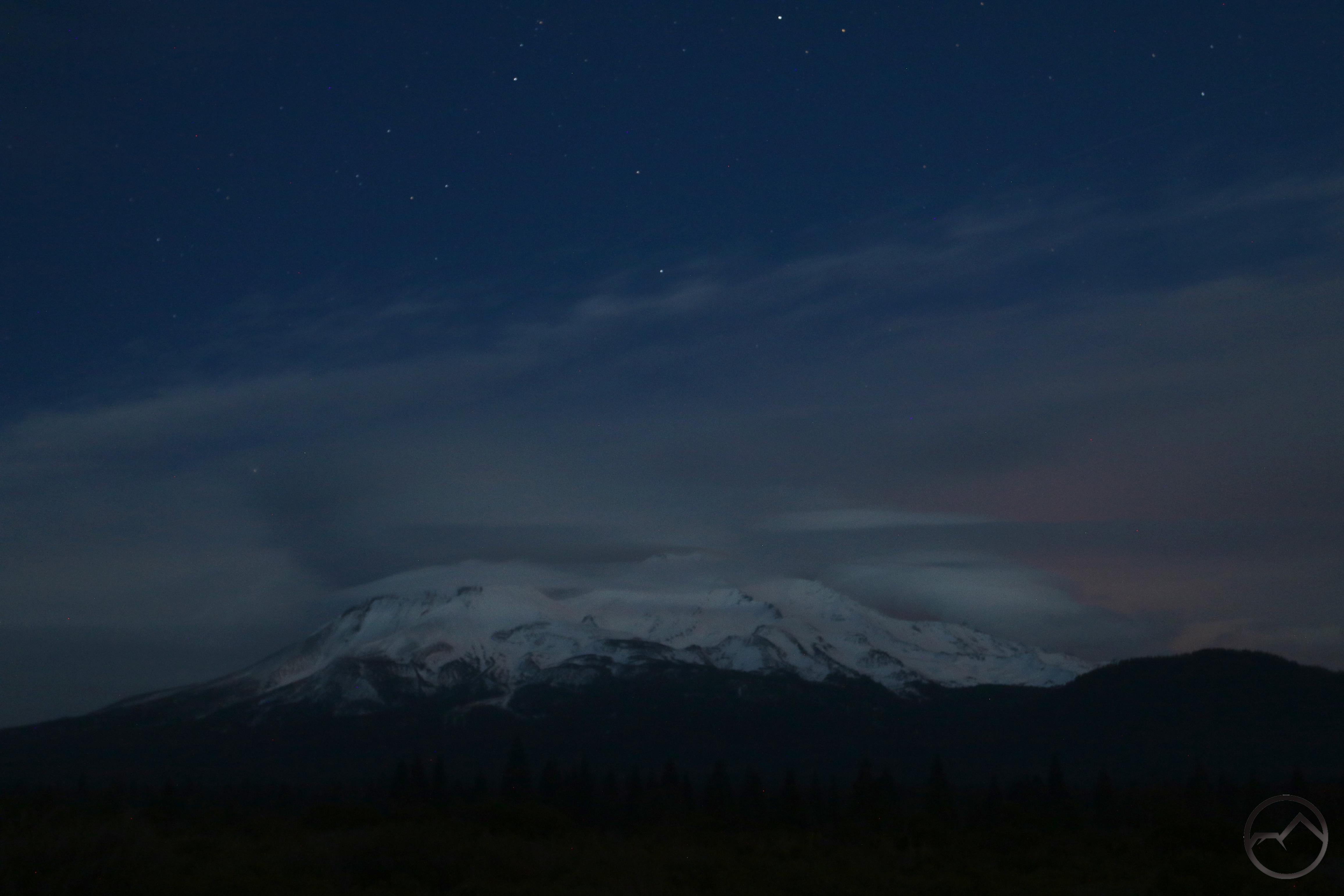 Sunday proved to be fairly overcast, with Mount Shasta barely visible through the clouds. It was with surprise then that I observed a fairly large and complex lenticular formation over the mountain after the sun had set and the clouds had cleared. My gracious wife encouraged me to go try to capture and image of it even though it was getting rather dark. Night photography is something I am definitely not skilled at but I could not pass up the opportunity to try to document the cloud. I took my oldest son and we headed off into the late twilight. The cloud was definitely worth observing but I had a hard time getting my camera focused and, in the end, it was just too dark. A near miss, but one that had me thinking that the next morning would be the morning for a spectacular lenticular. I would be ready to go and not miss this opportunity.