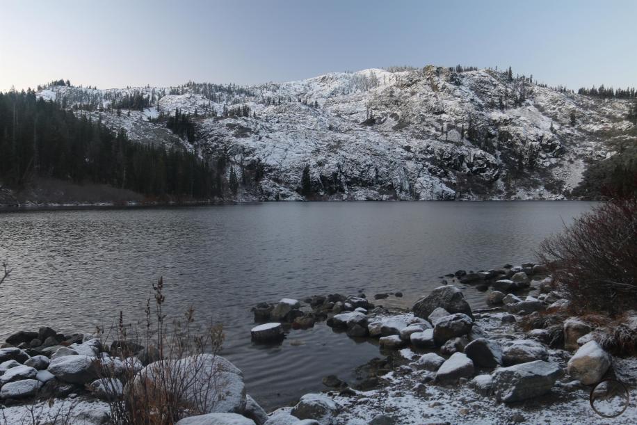 My first stop was Castle Lake, where a slight dusting of snow covered the ground. Though the cliffs were white, I am not sure a lot of it was snow as much rime ice. The way the rocks and trees were coated white made it look like the clouds had been low to the deck.