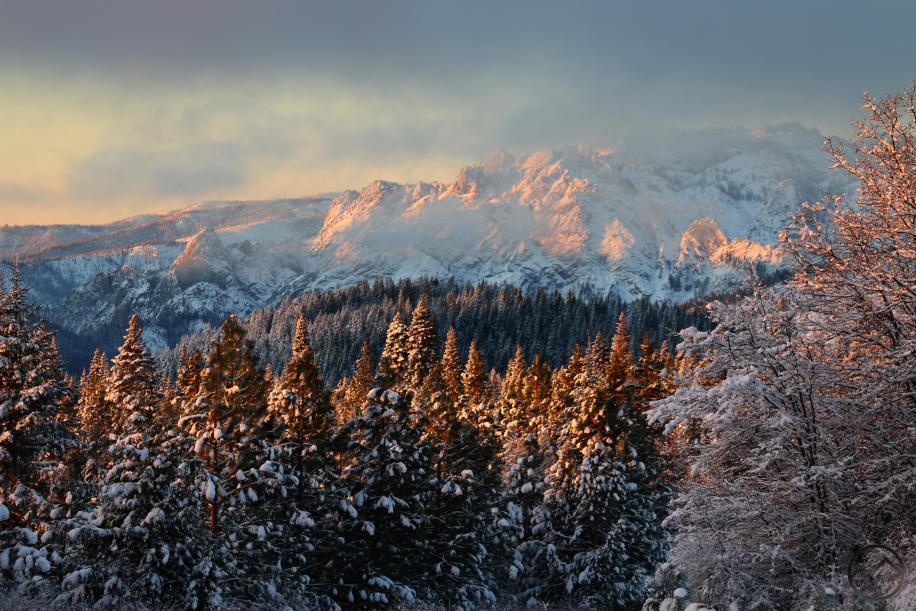 I love this view of the Castle Crags in the morning, especially when the tree are laden with snow. This is pure winter glory.