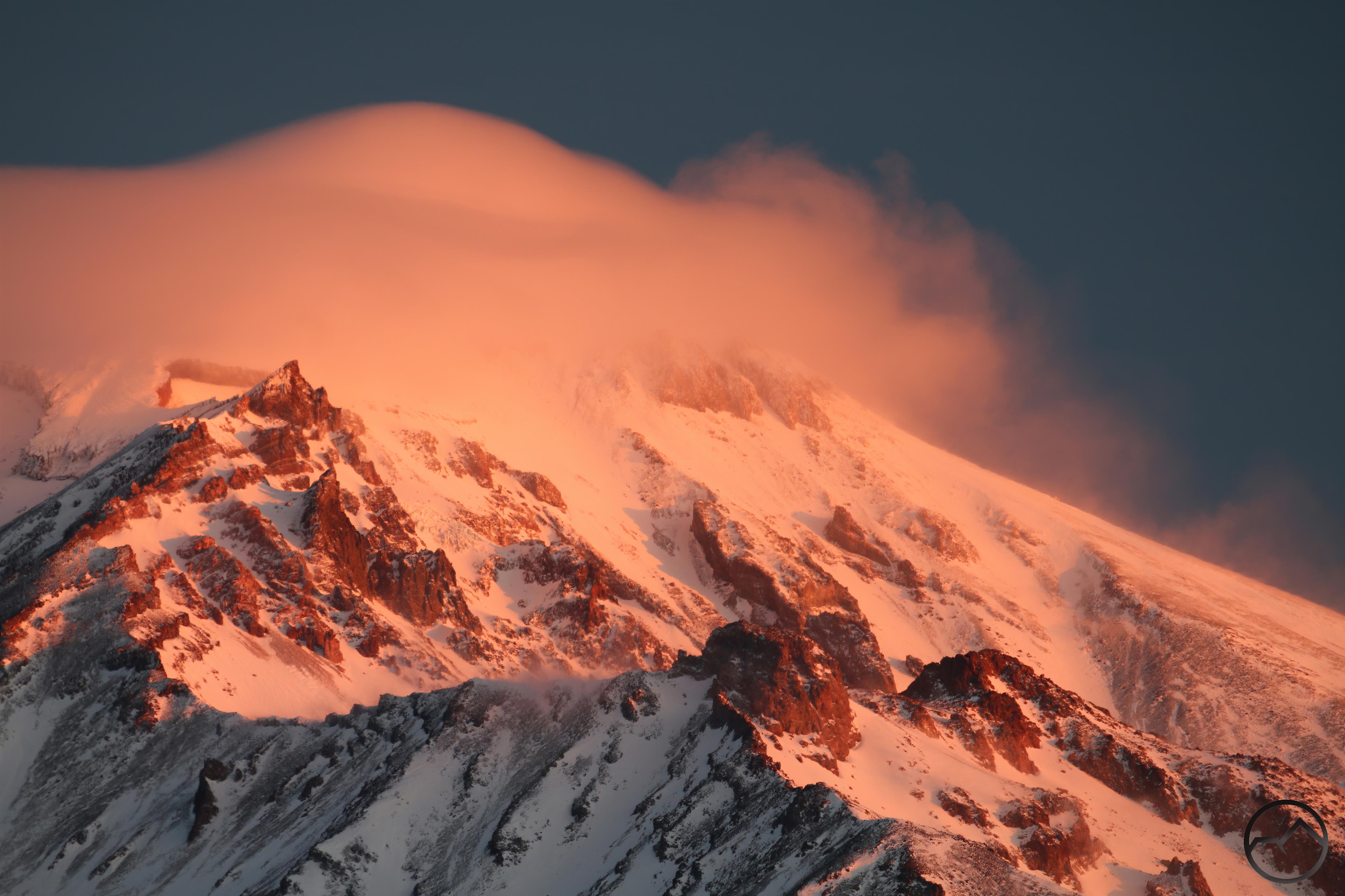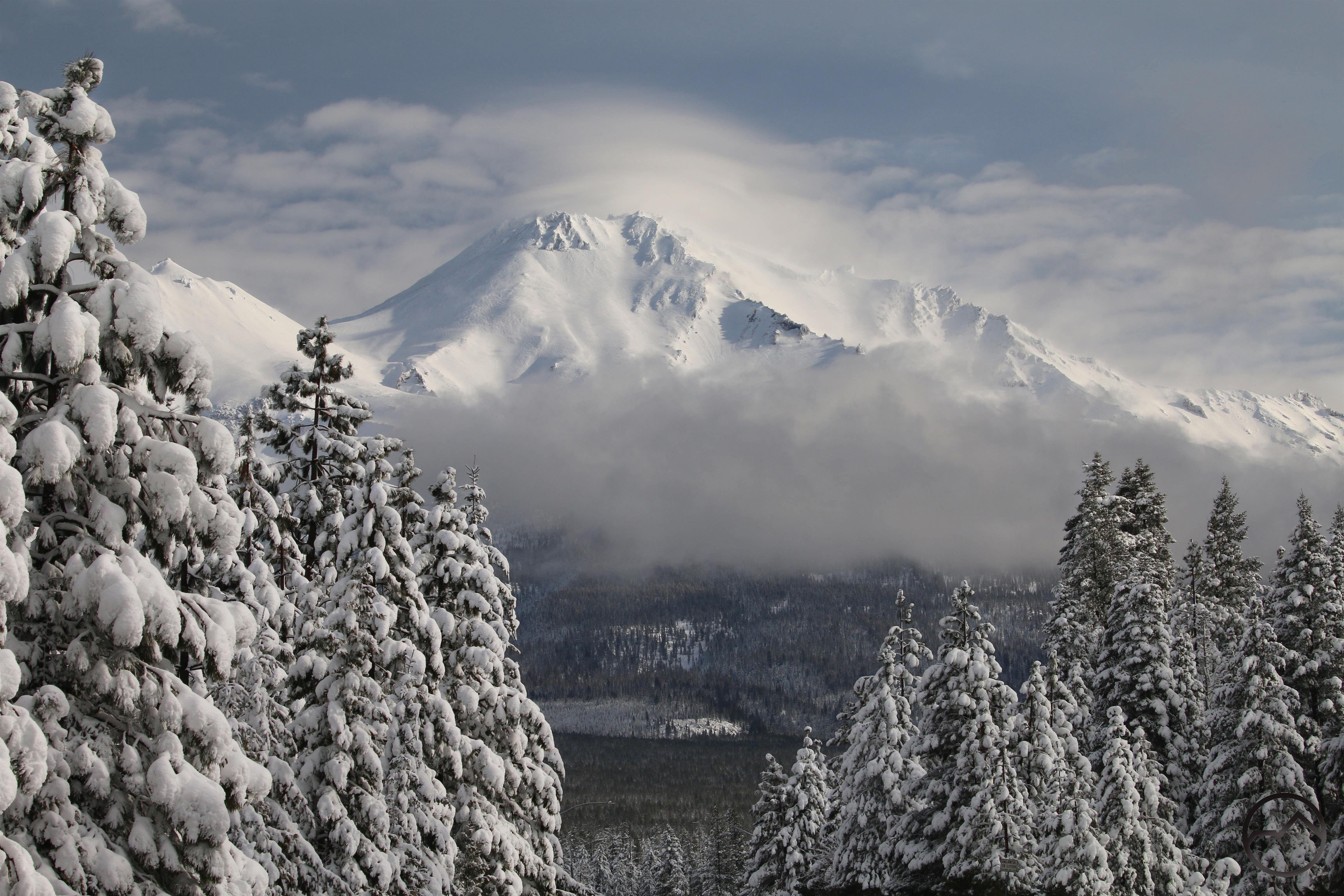 Mount Shasta makes a brief appearance in between waves of the storm.