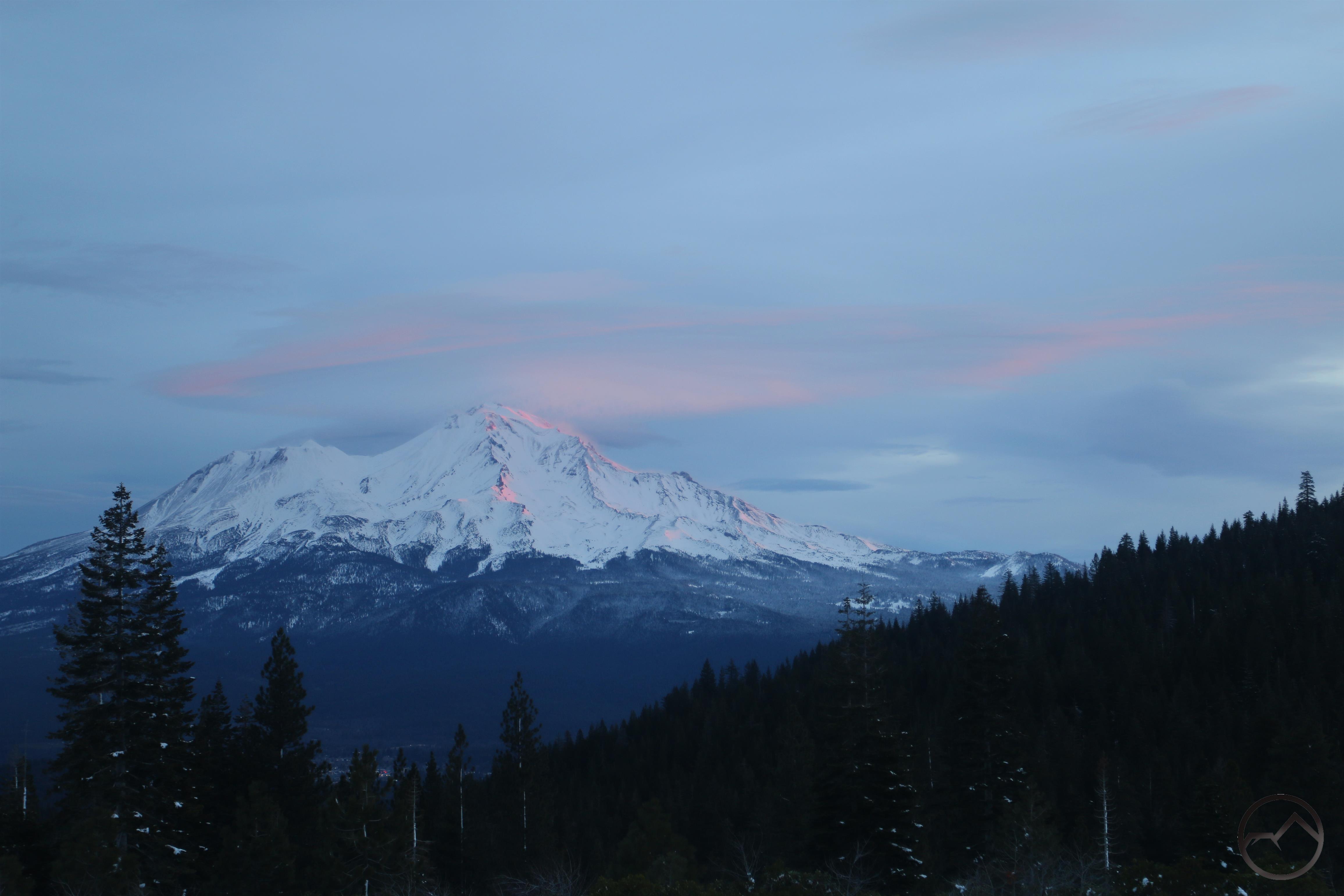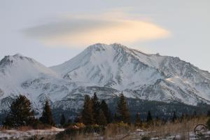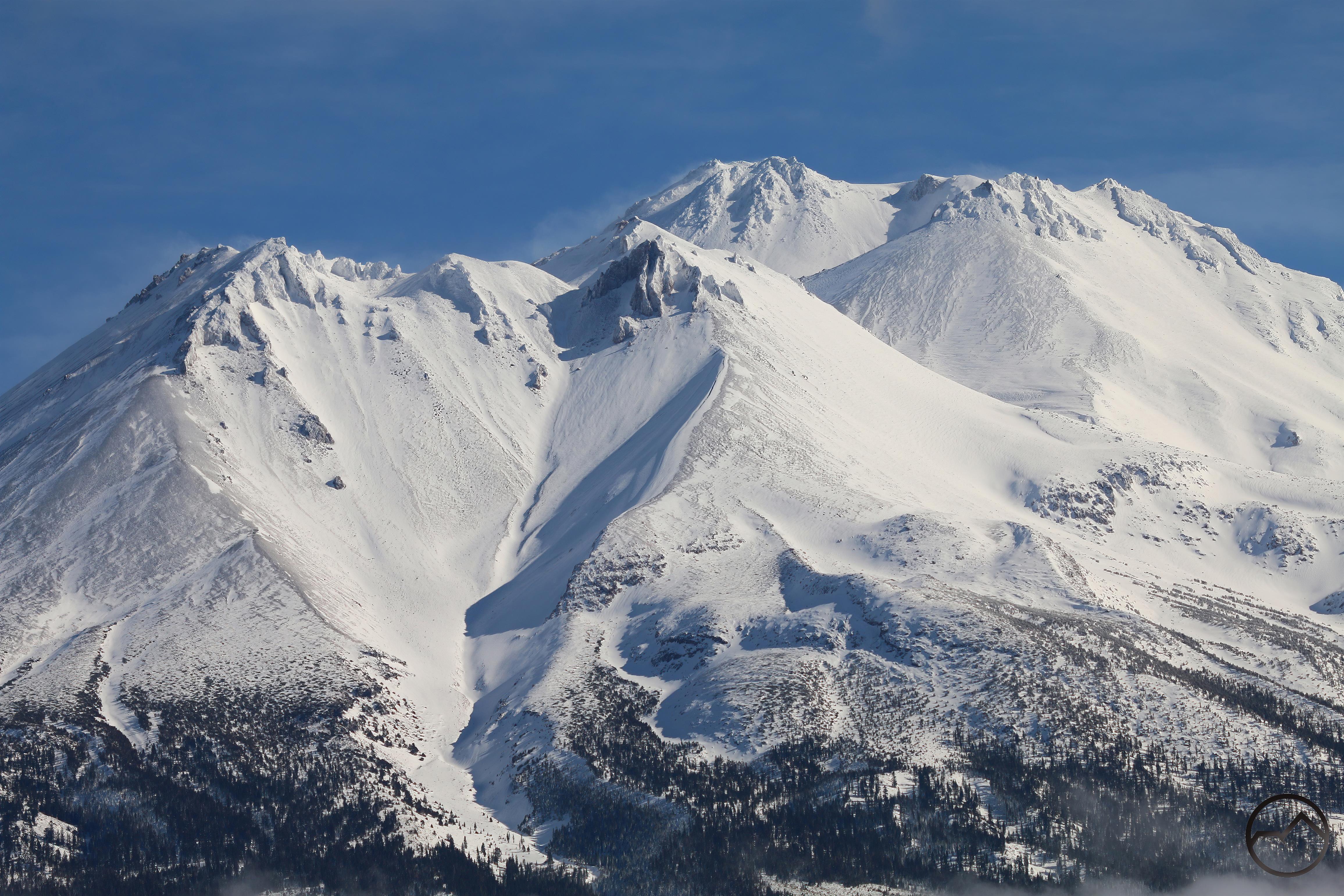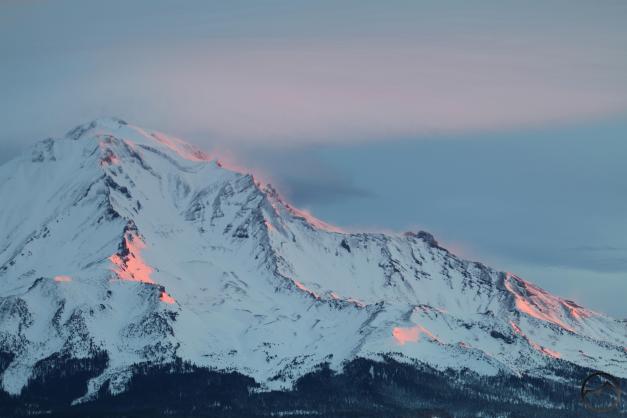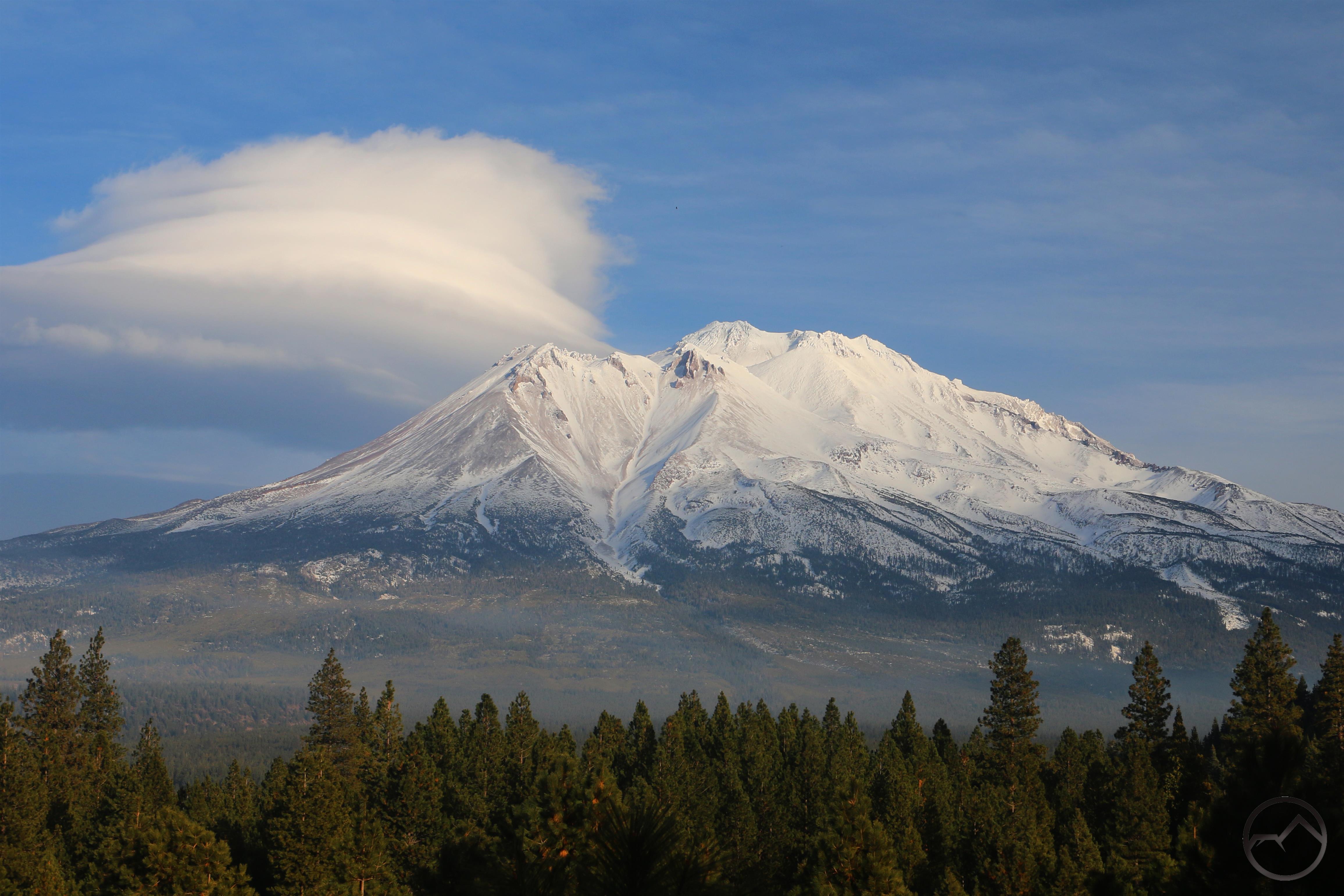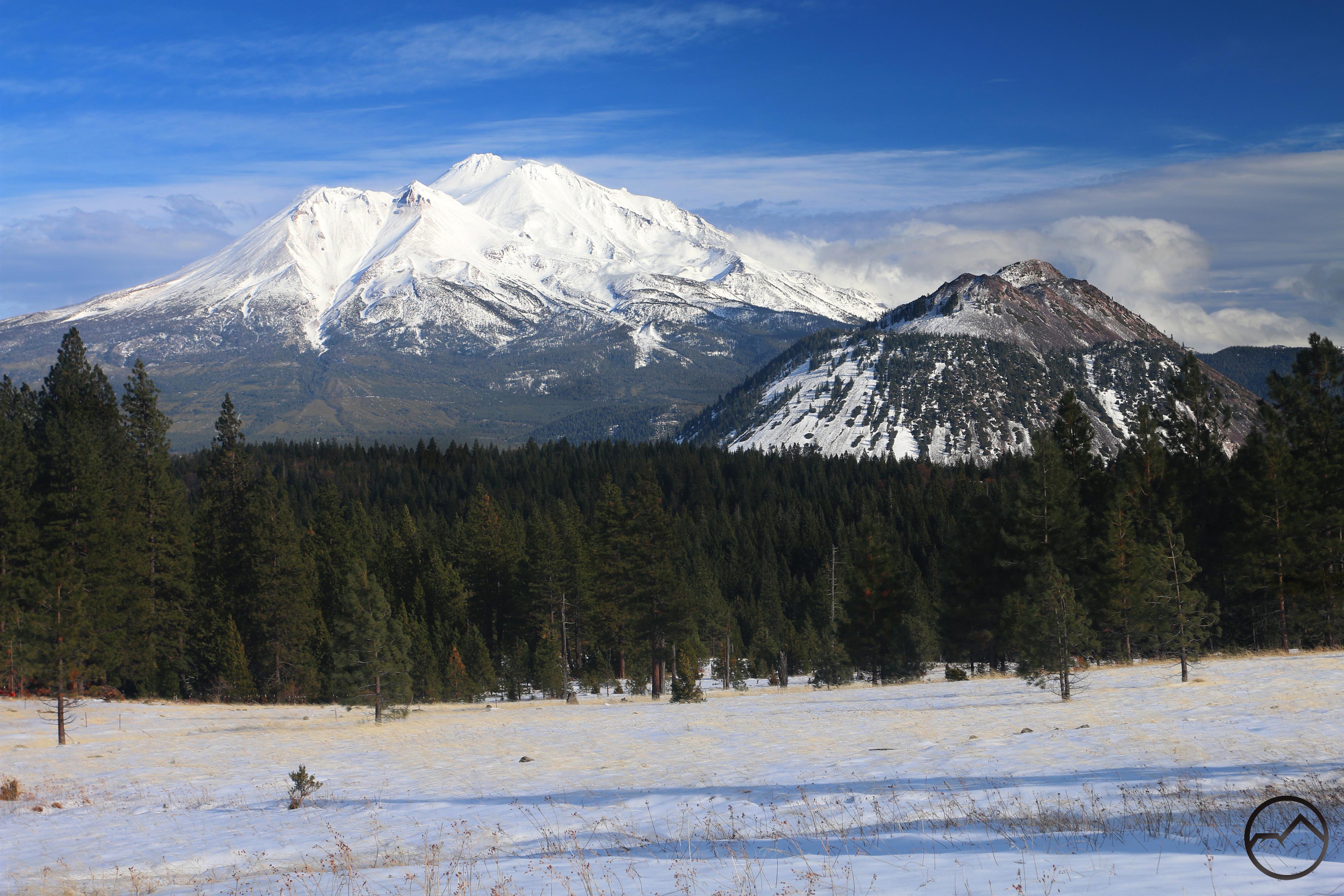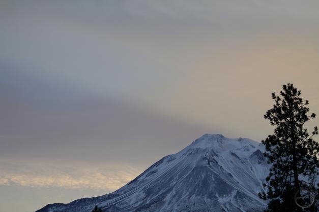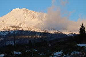Mount Shasta, looking white but with exposed ridges still shorn clear by the wind.