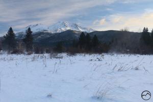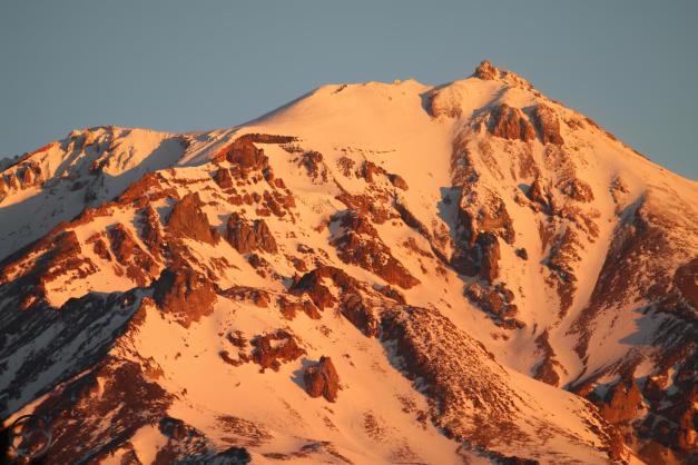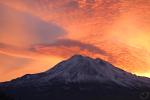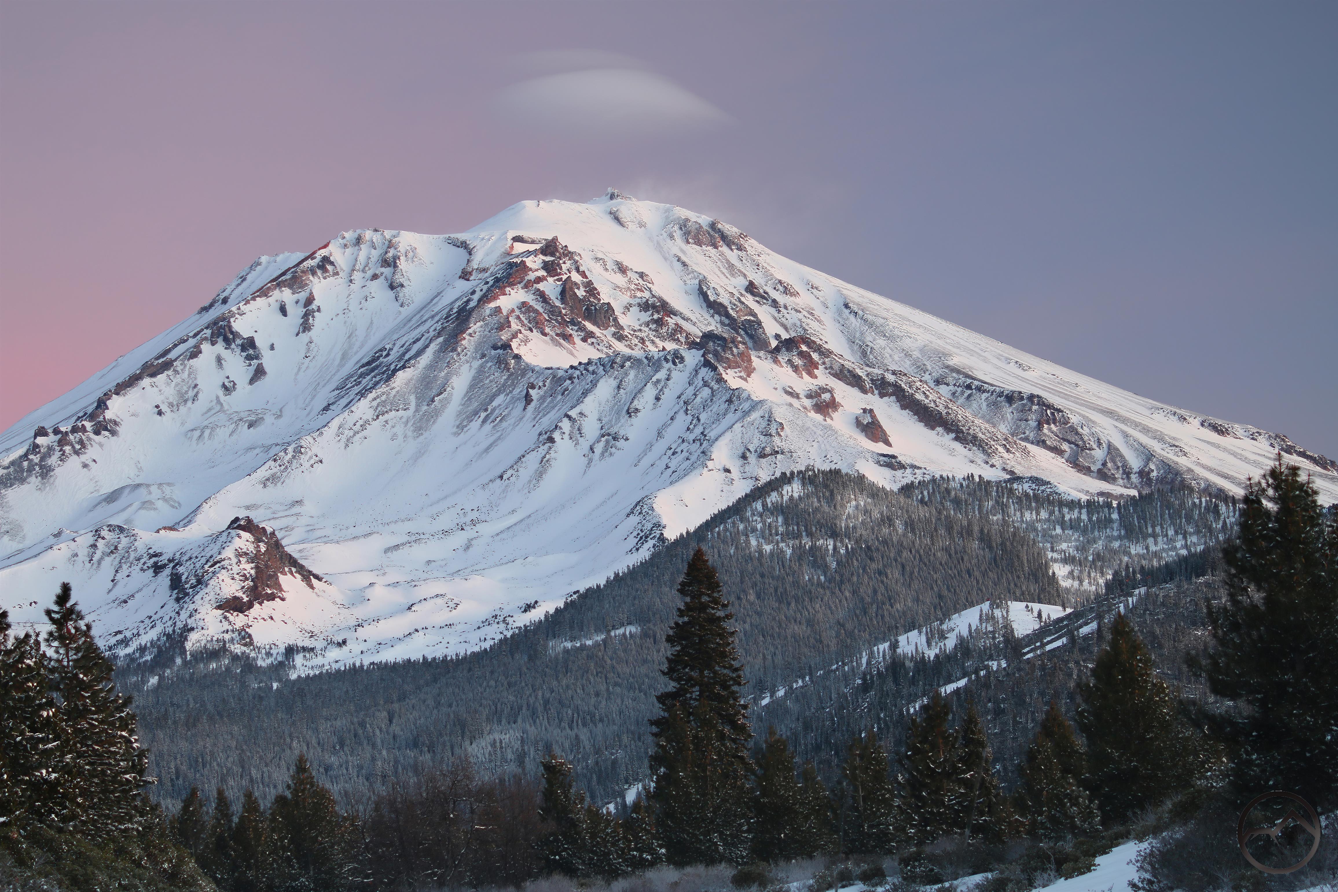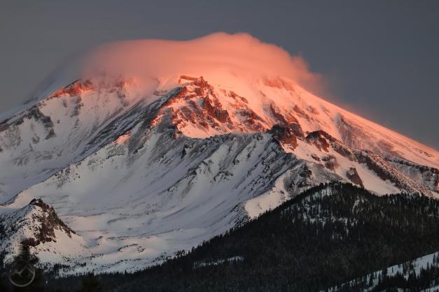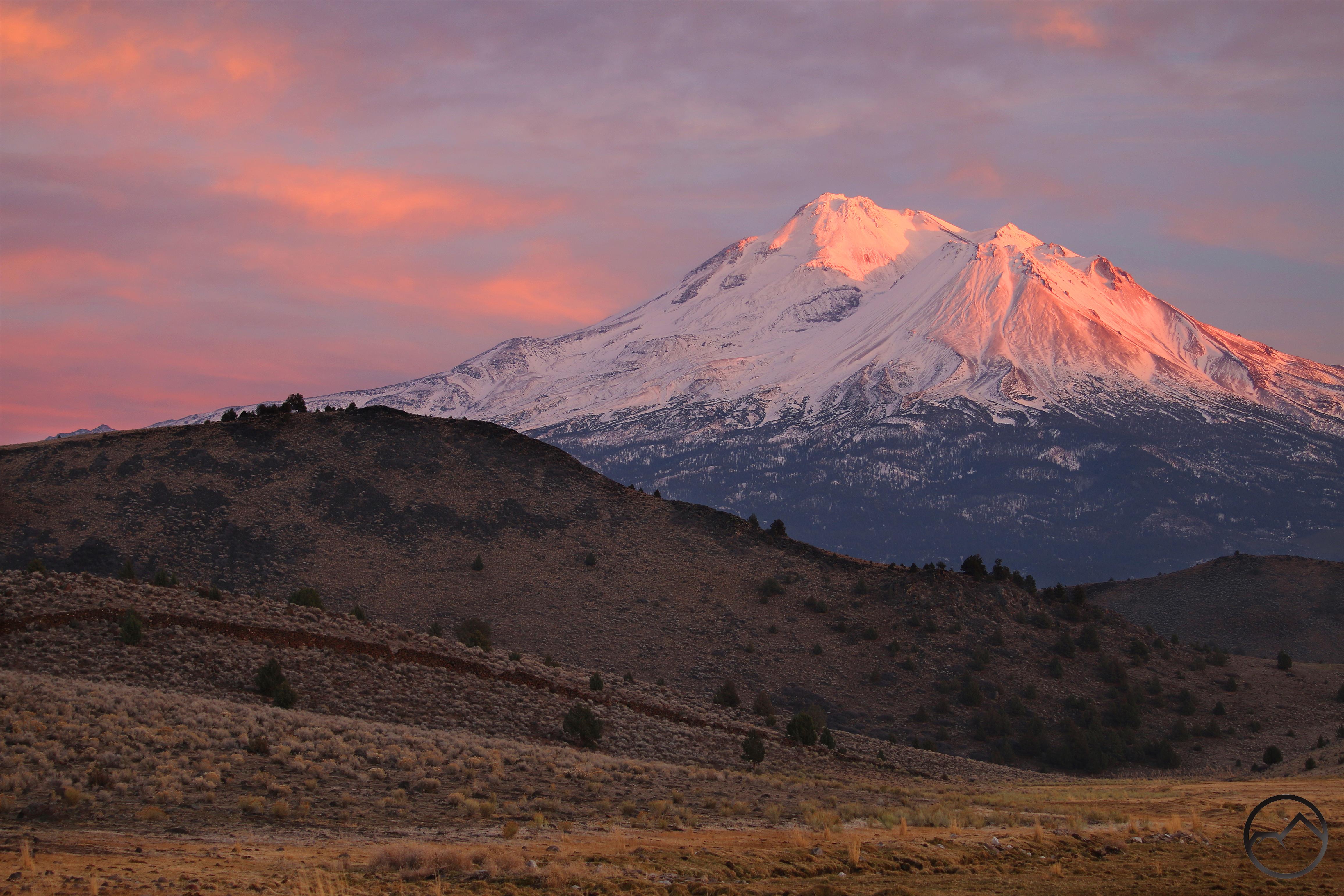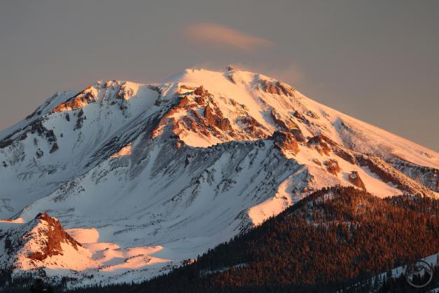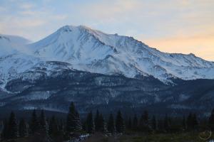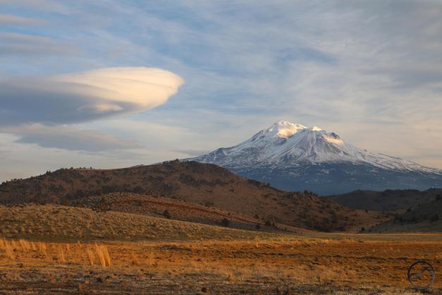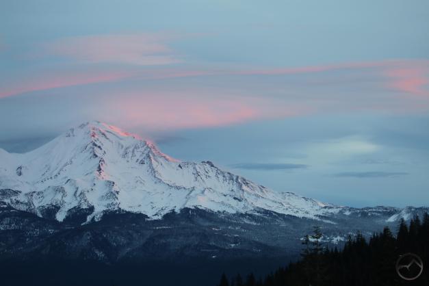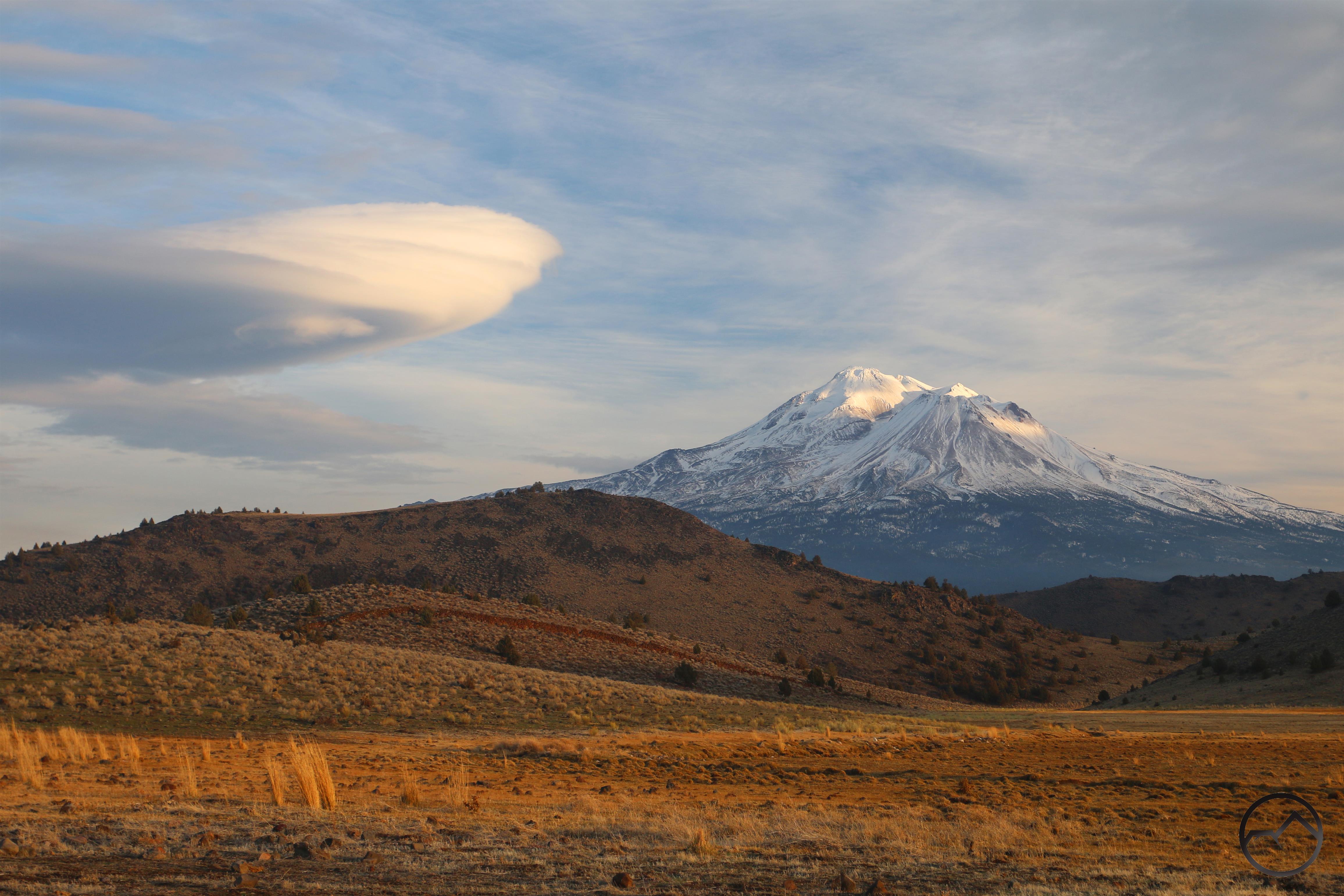 Mount Shasta, looking white but with exposed ridges still shorn clear by the wind.