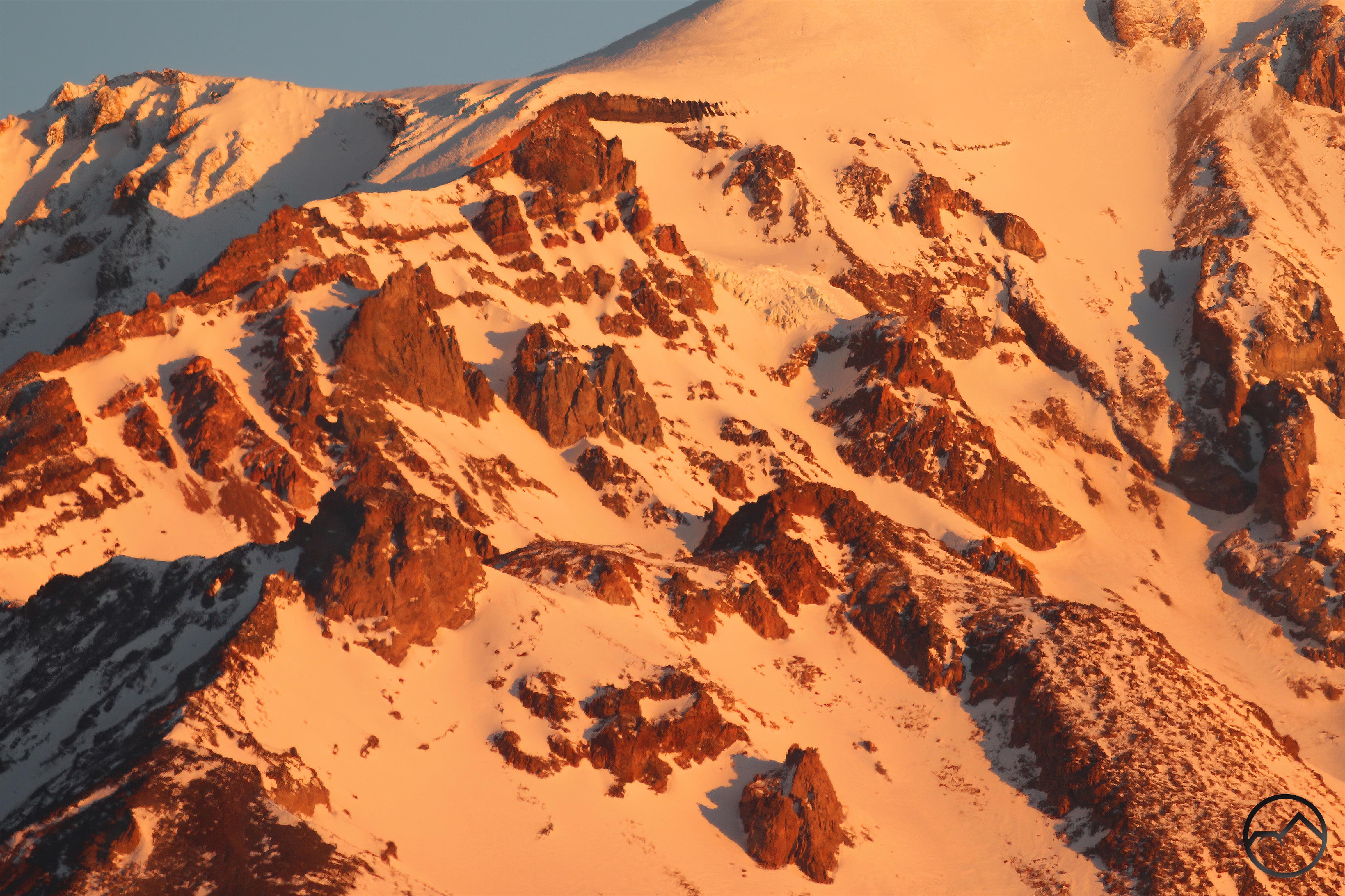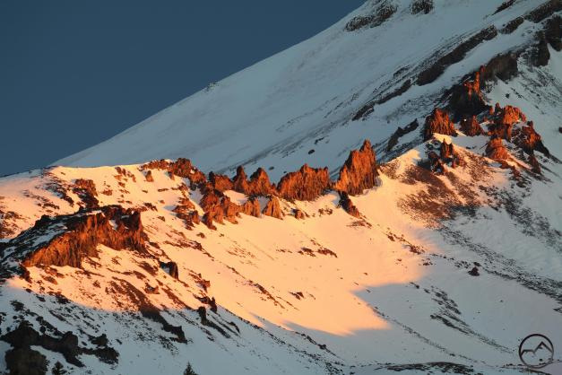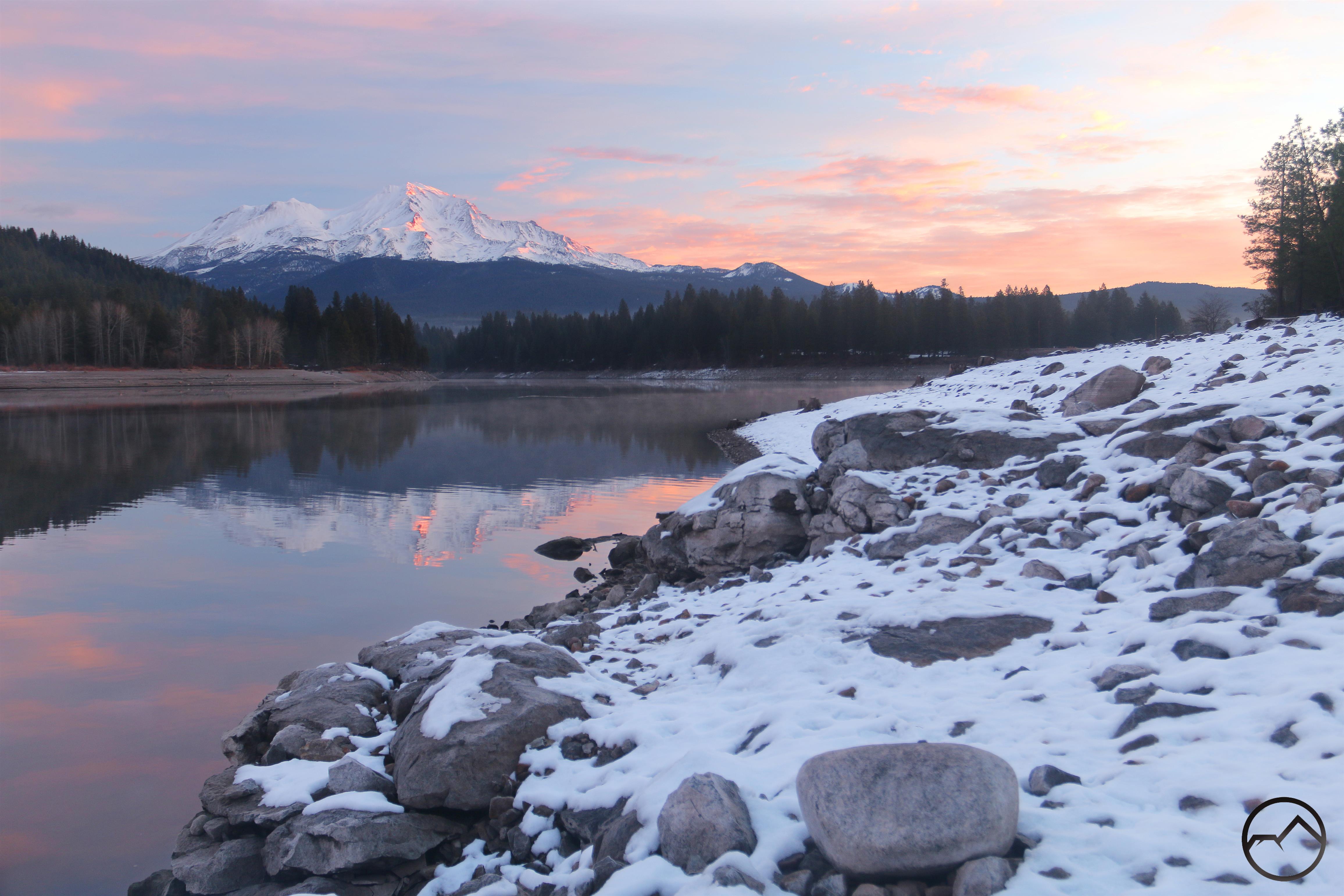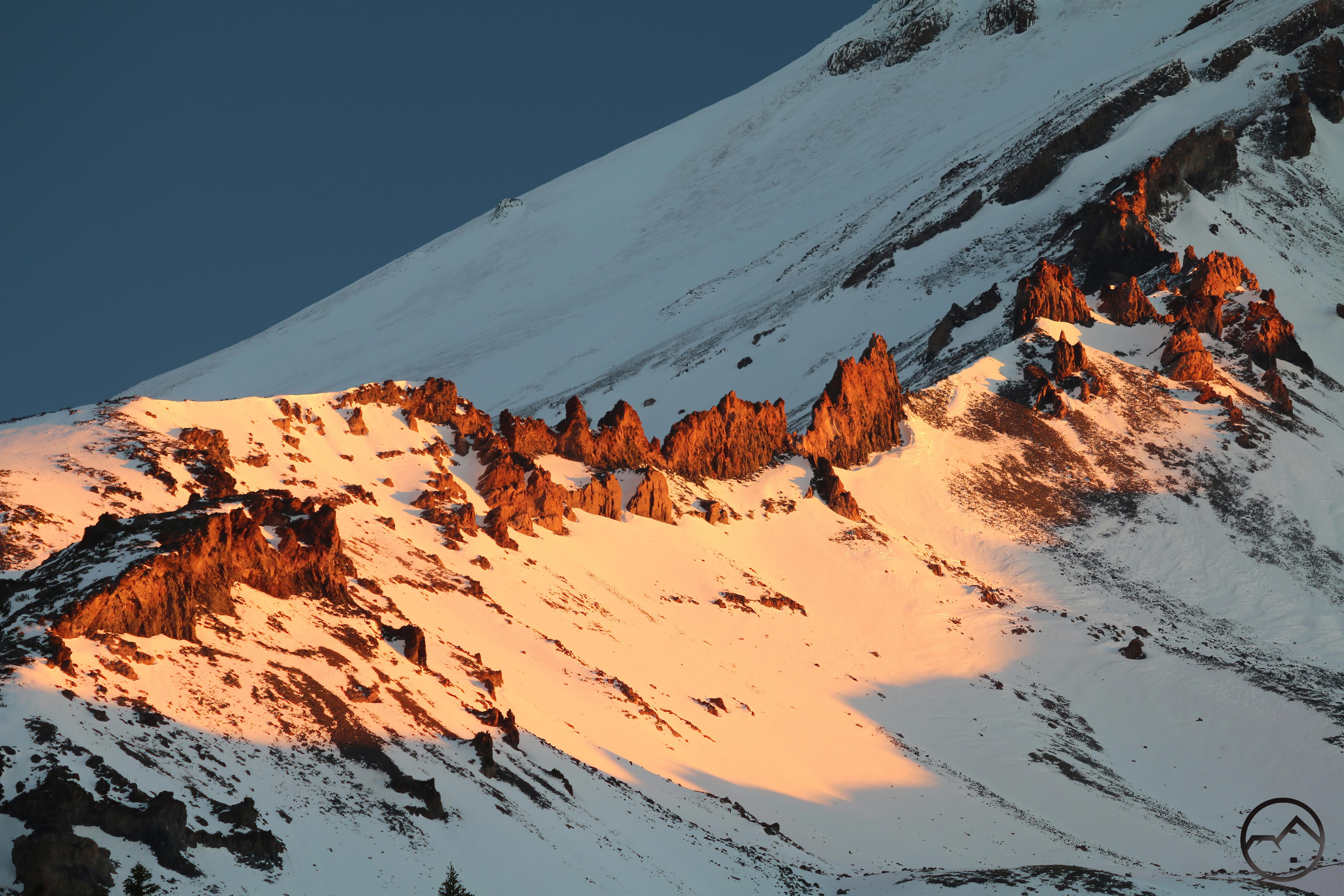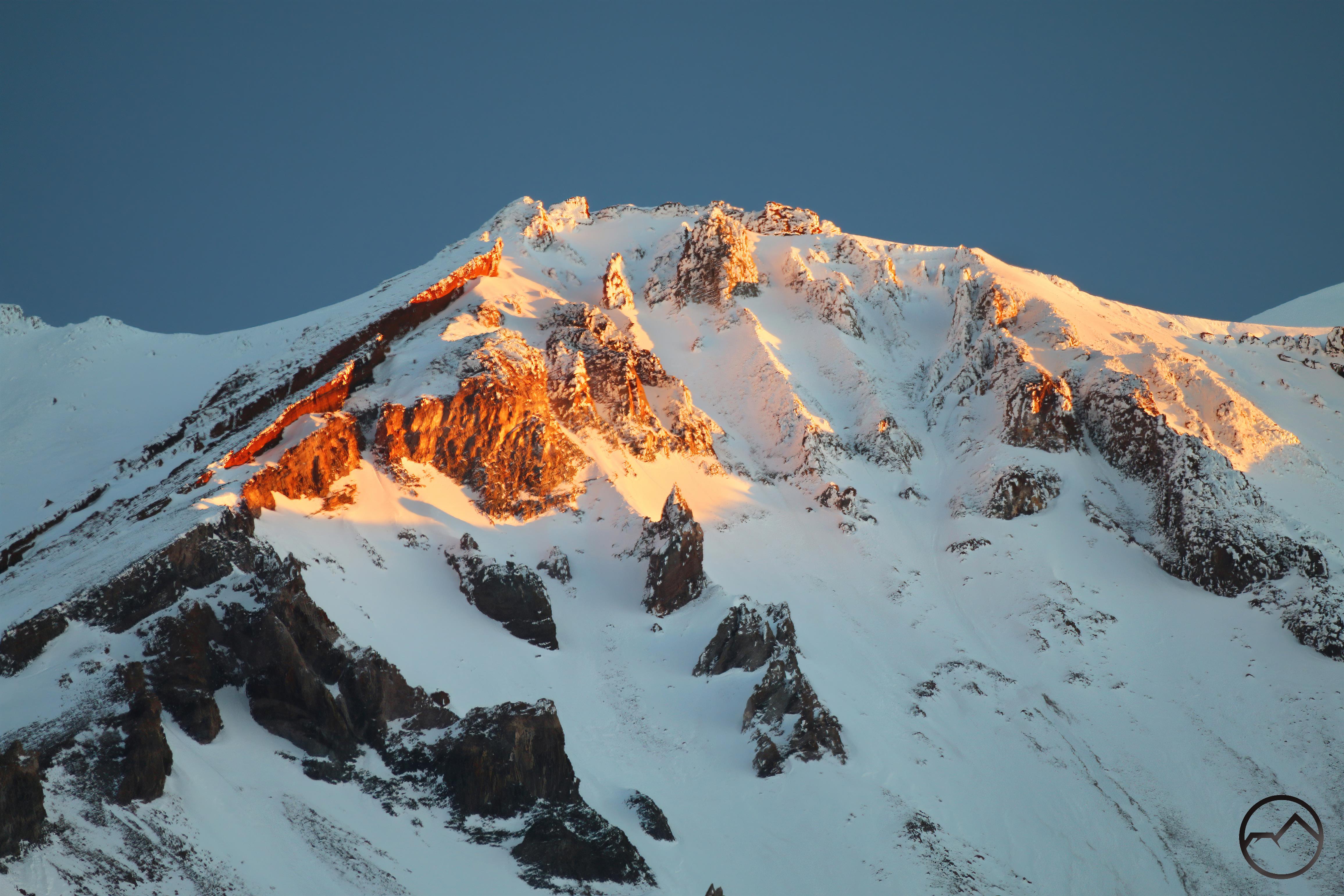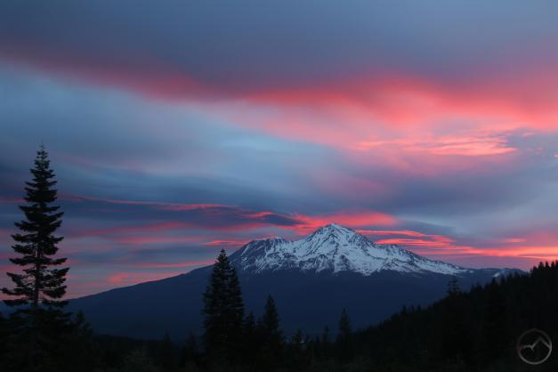 Mount Shasta, looking white but with exposed ridges still shorn clear by the wind.