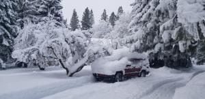 When added up, from Tuesday through Friday, this storm was forecasted to drop a heap of snow. Tuesday night alone was stated to drop “a foot or more”. It delivered, dumping an impressive 20 inches at my house. It proceeded to accumulate another foot or more beyond that over Wednesday and Thursday. Fortunately this was a dry, powdery snow so clearing it was not as big a deal as it would have been if it had been more of the “Sierra cement” that Northern California mountains are infamous for. I’ll take 3 feet of dry powder over a foot of wet cement any day. Not only is clearing it easier but the snow does not shear branches off trees as readily and knock the power out.
