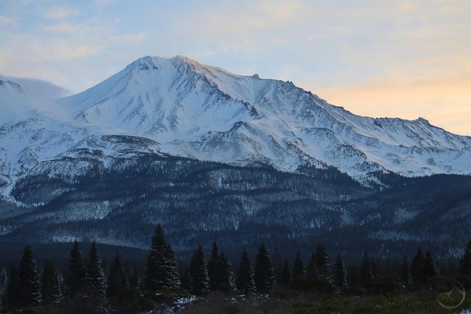 The snow was pure powder so the wind kept it from piling up on the exposed parts of Mount Shasta.