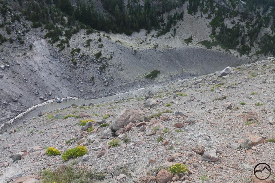 A glance downstream into the inaccessible depths of the canyon. The loose walls make travel into the canyon difficult.